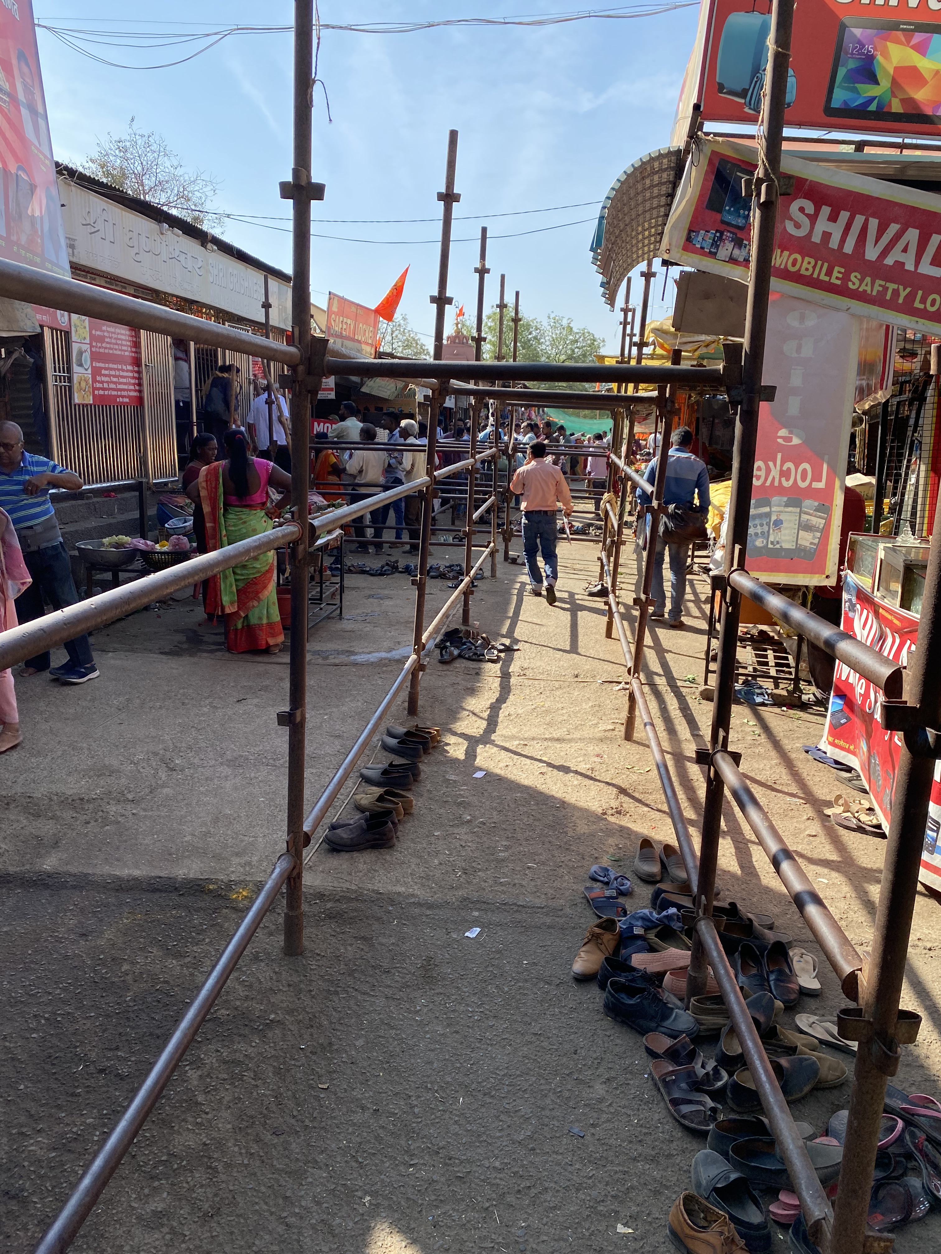 We set off at 8.30 AM and we arrived at the entrance arch to the Grishneshwar temple. It had taken less than an hour and on the way we had passed the conical hill on which the Daulatabad Fort stands. Looking up, we patted ourselves on the back for our foresight in deciding to skip the steep climb. Grishneshwar is the smallest of the twelve jyotirlingas. The approach to the temple has small shops selling puja items such as flowers and temporary railings to manage queues on festive days could be seen. Today was not one such day and hence we were able to move quickly.