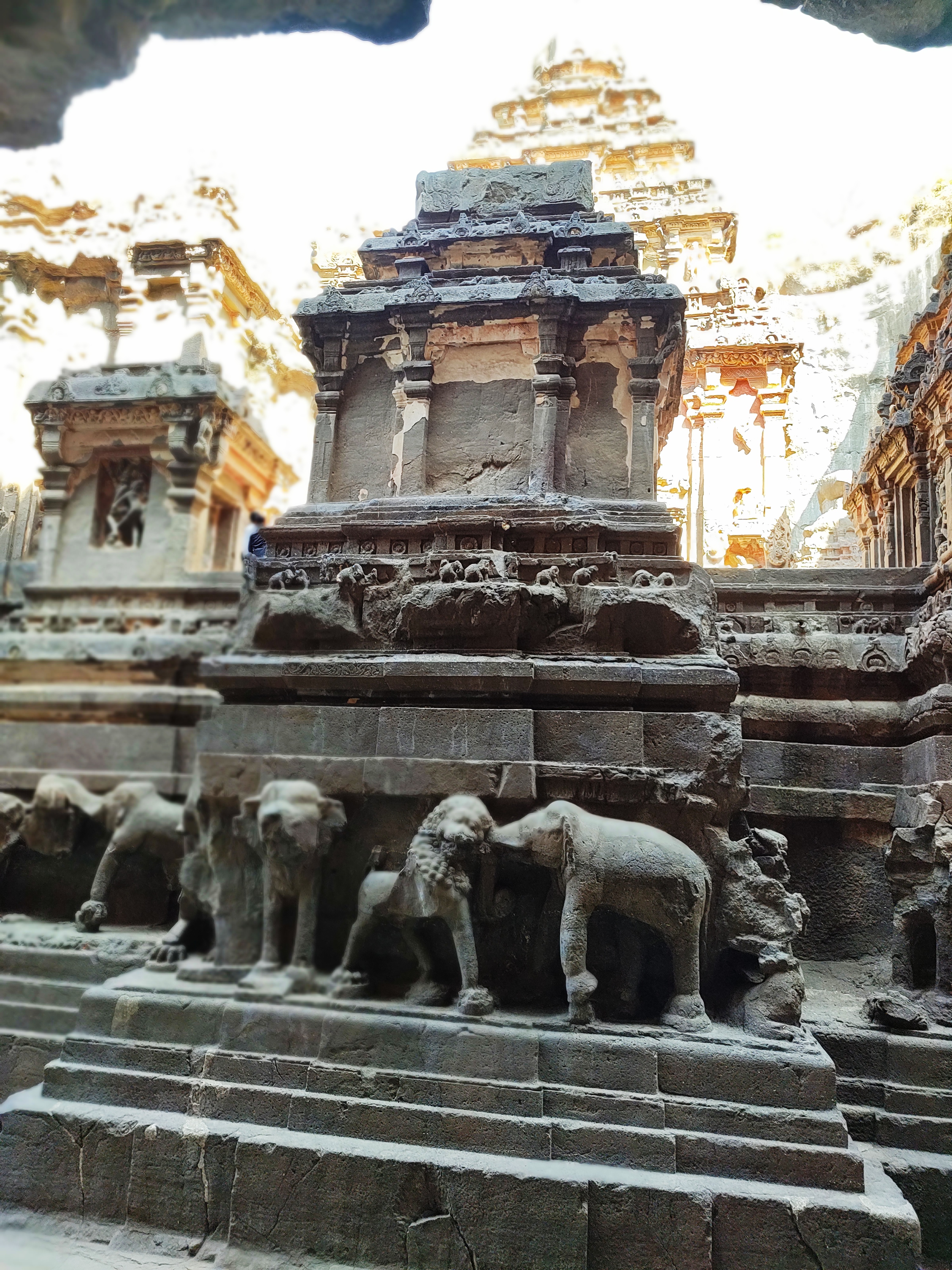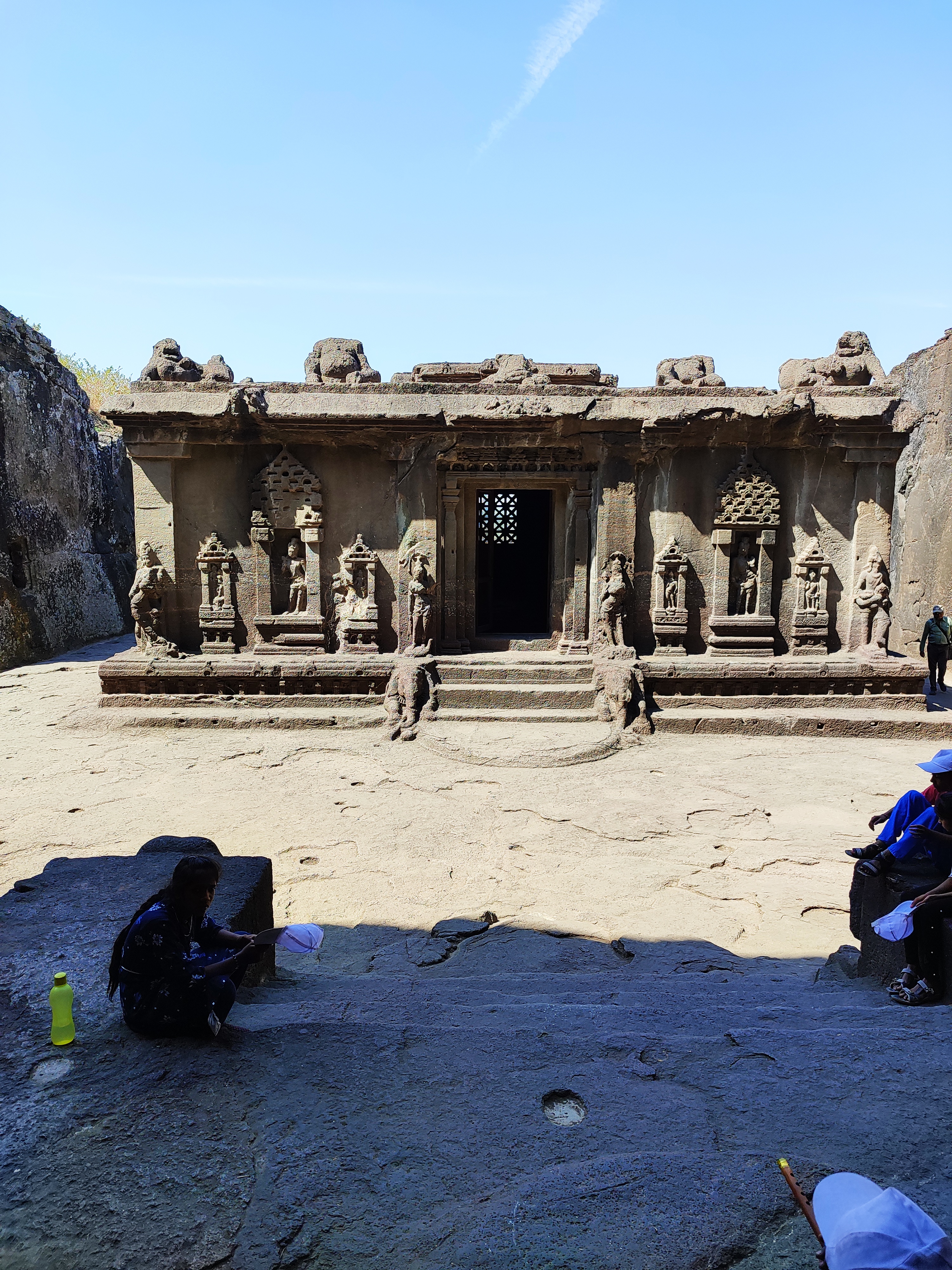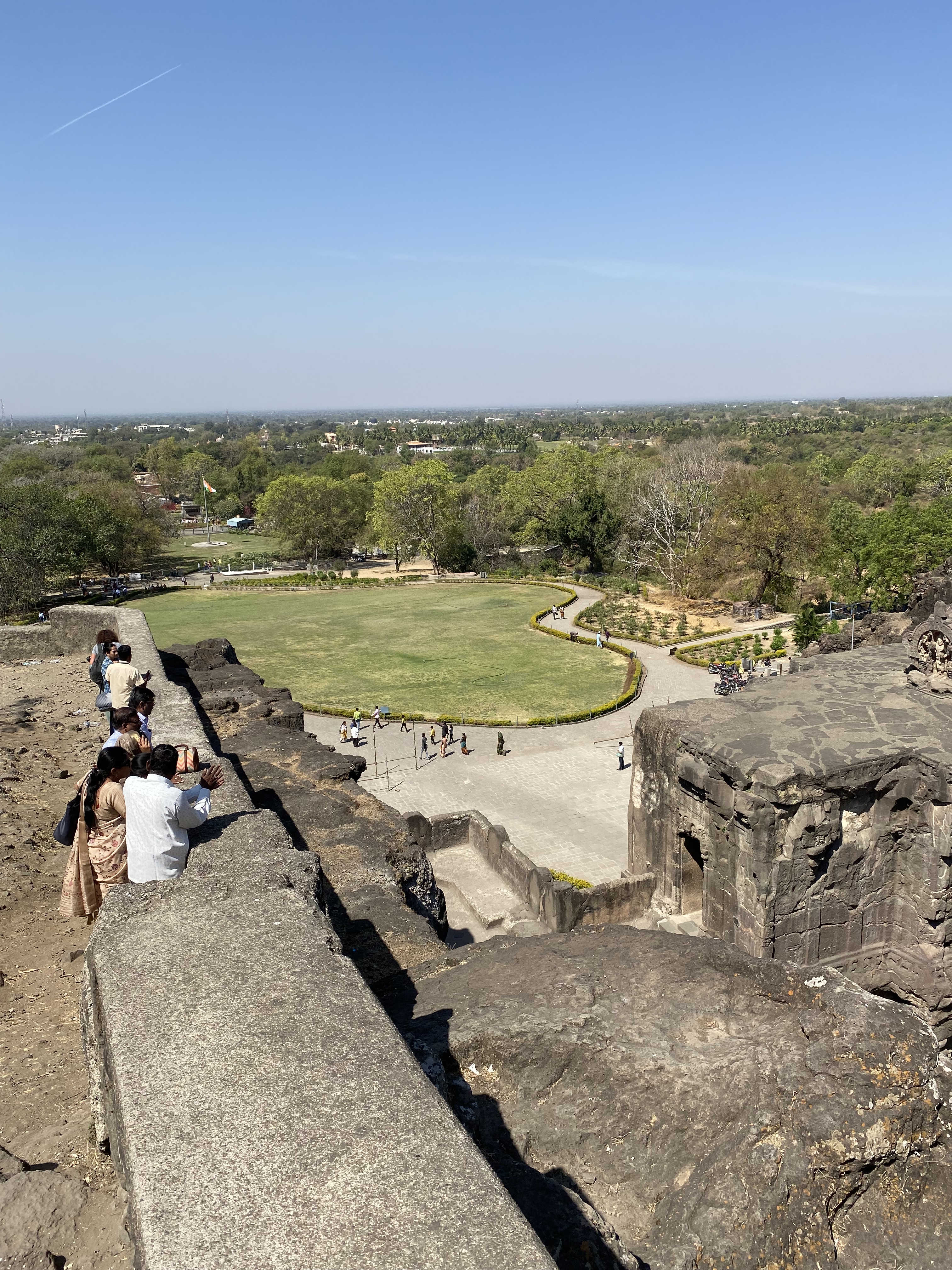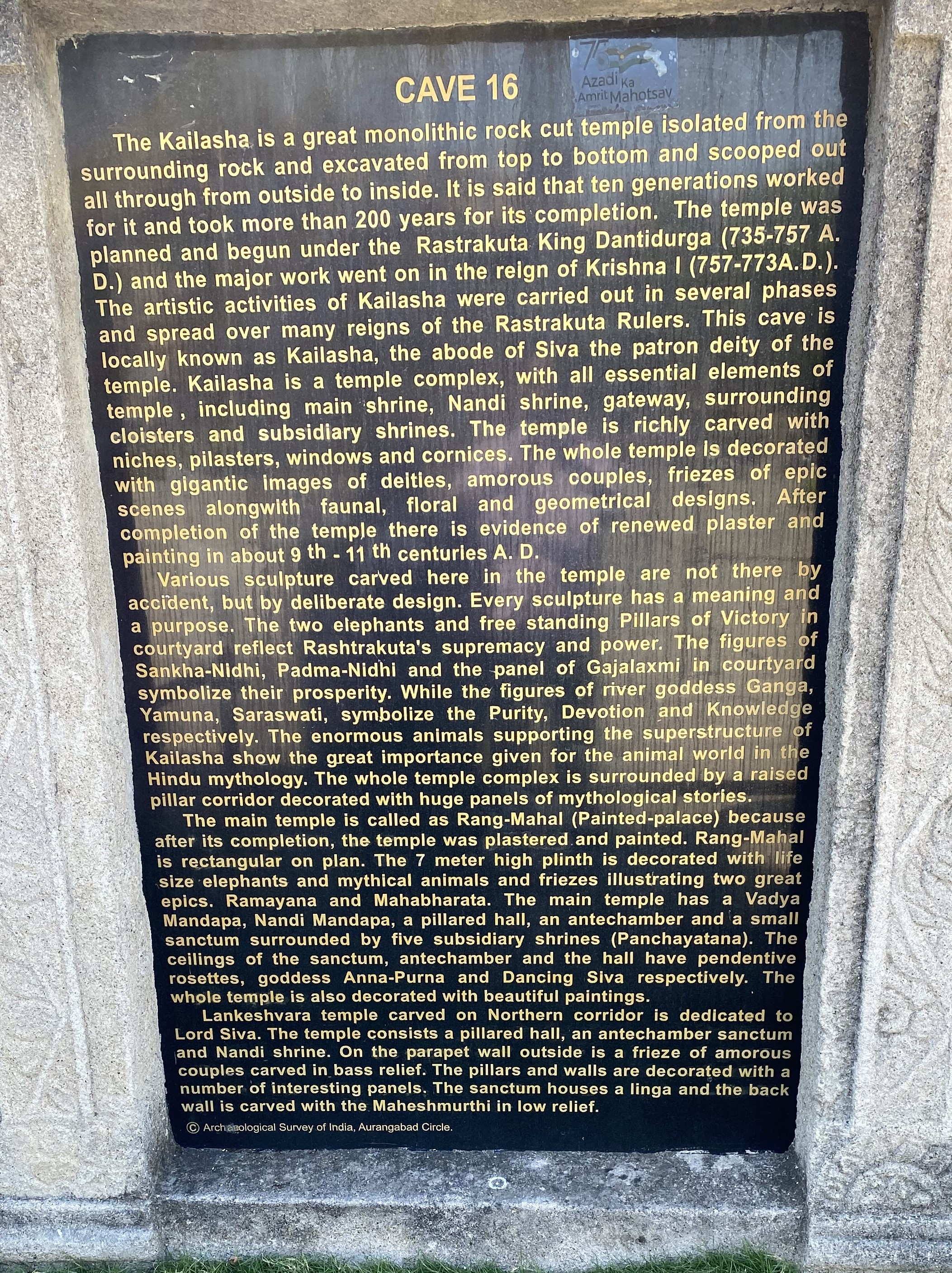 As we walked around the well-manicured lawn, we found ourselves right in front of Cave 16 – Kailasa Temple. Caves 17 to 30 to the right and 1-15 to the left in a sweeping arc.