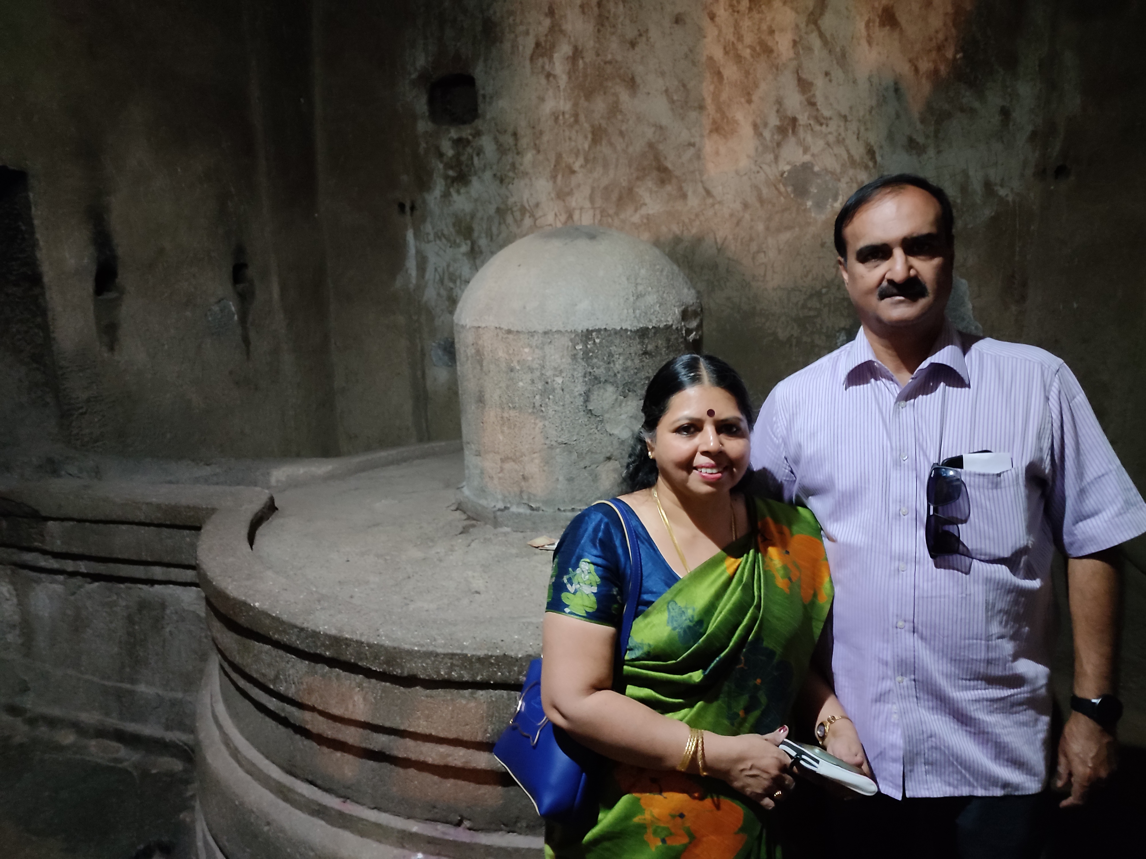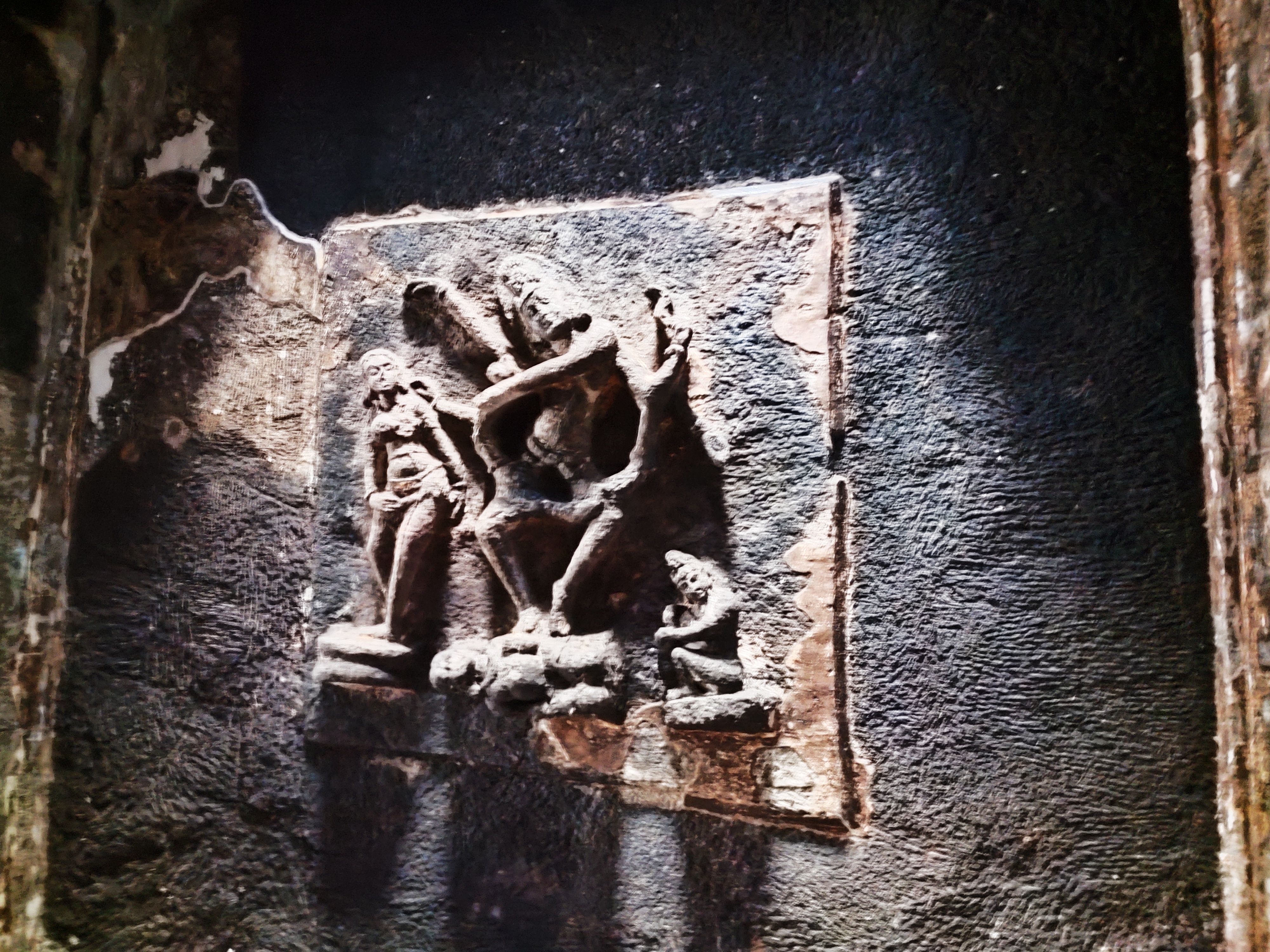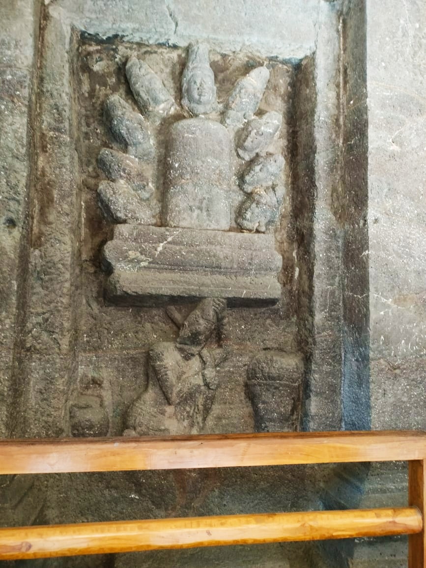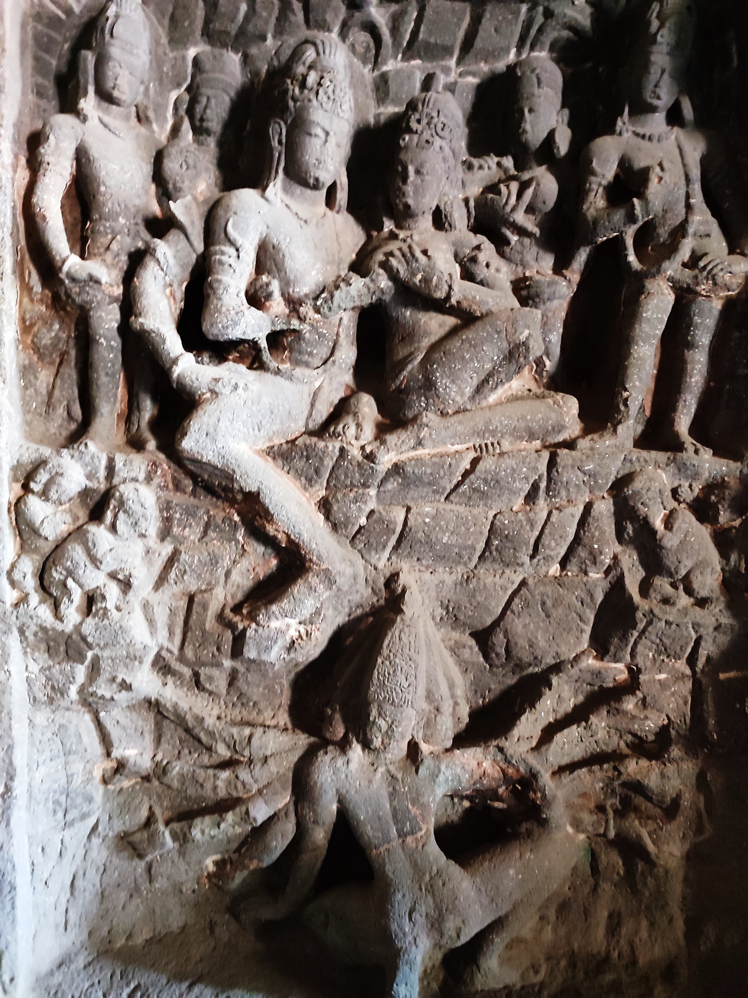 We climbed up to the first tier of the main temple block. Wow! What a sight! An exquisitely carved mandap, a mini-courtyard, the main temple hall and then the inner sanctum sanctorum. Admiring the carvings in the mandap, some of them amorous too, we walked across to the main hall after removing our footwear at the entrance. A defaced Nandi holds pride of place. The supervisor was kind enough to allow us to enter the inner sanctum ( normally not done) and touch the original stone Shivling – Kailasanatha.