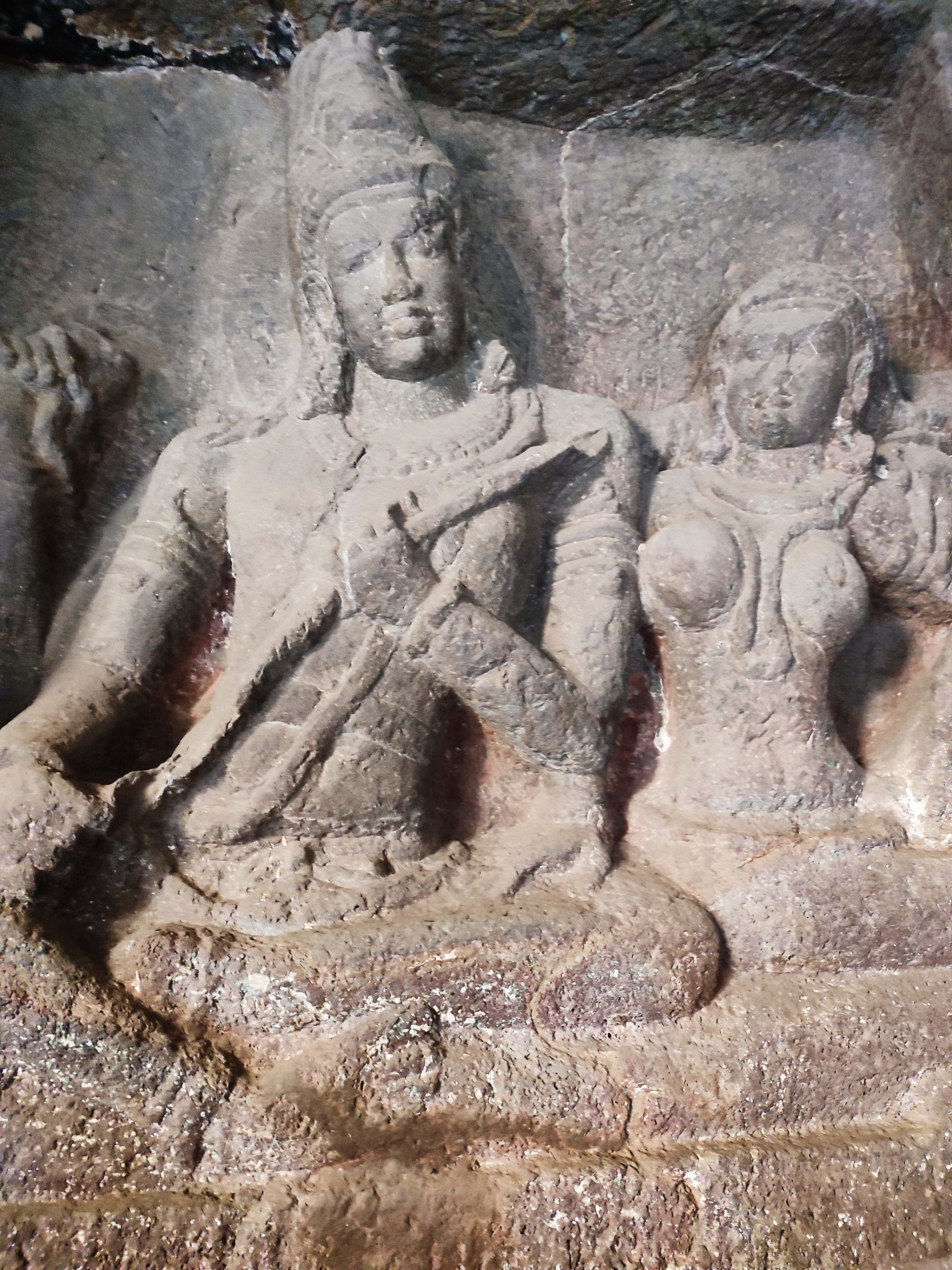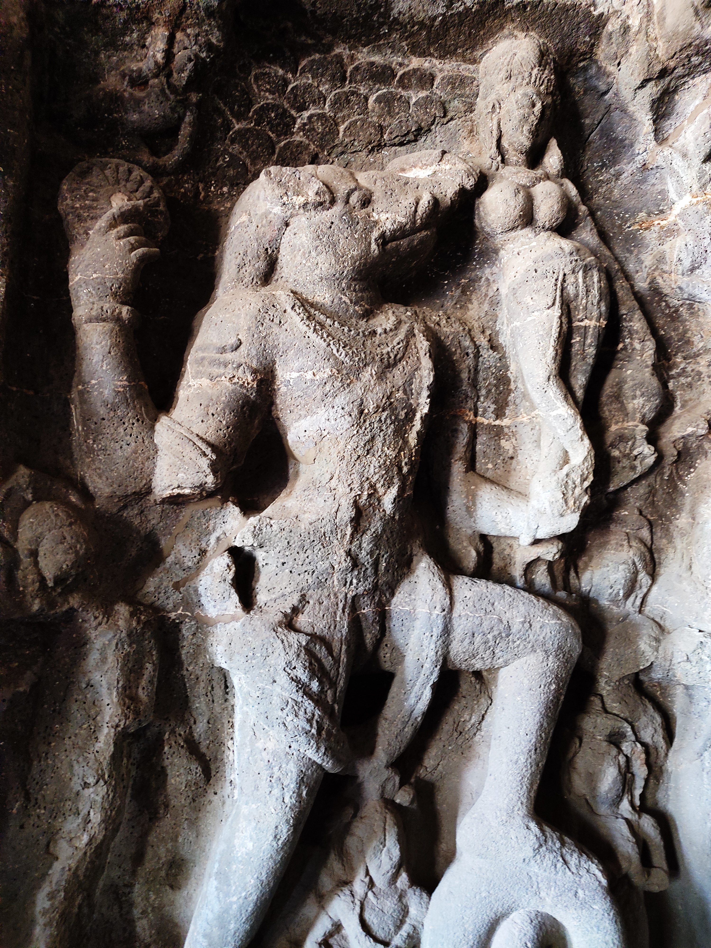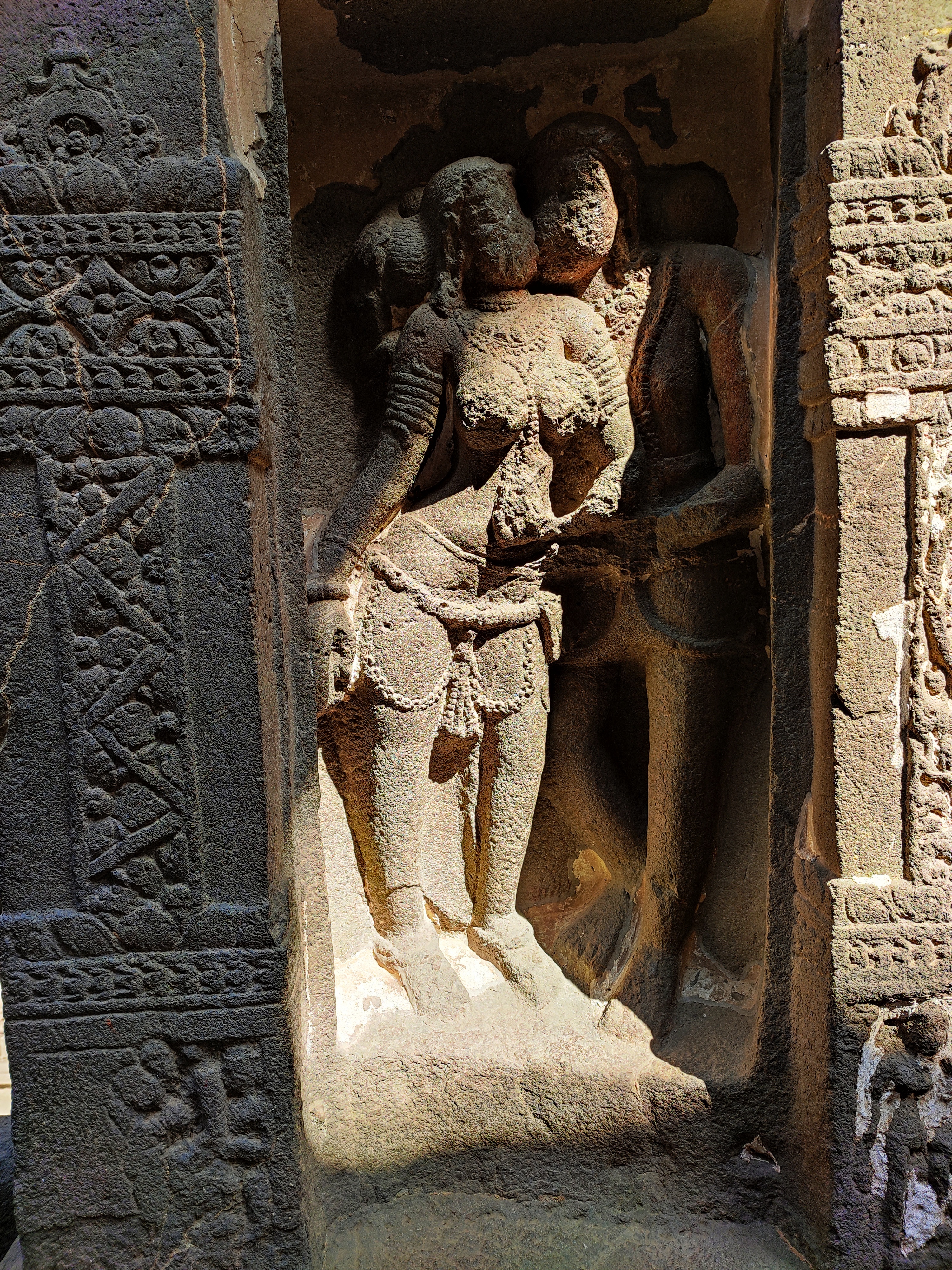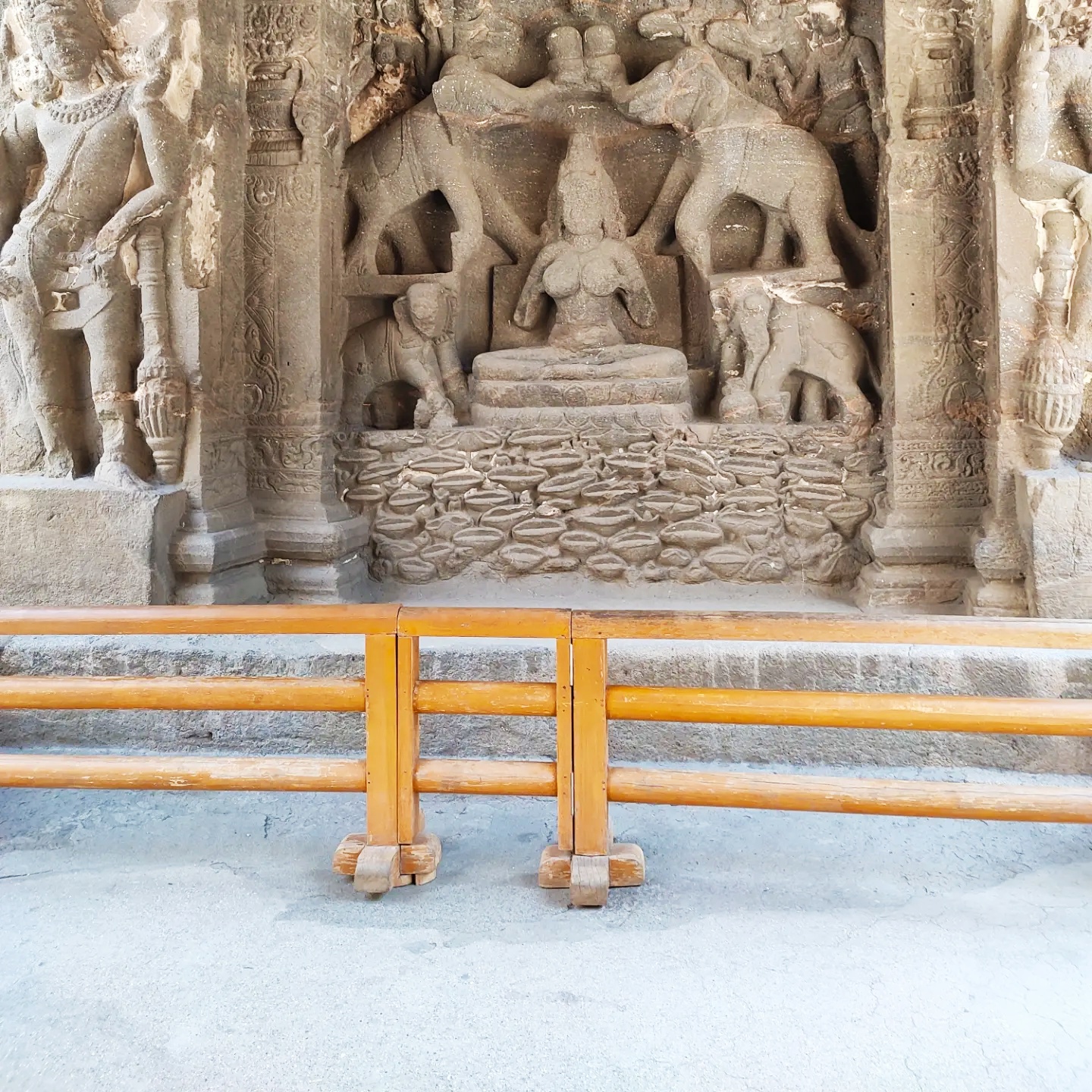 A drive of 5 minutes and we were at Ellora. Apart from the differences between Ajanta and Ellora cited in Ajanta Ellora – Day 1, we came to know two other differences at the Ticket counter. Ellora is closed to the public on Tuesdays, unlike Ajanta, that is closed on Mondays. Secondly, while the entry ticket costs Rupees Forty for Indian citizens at both sites, Ellora issues plastic discs or tokens unlike Ajanta, where paper tickets are issued. Once you show the discs, you are allowed access with the remark that the disc should be kept safe and dropped at the box set for it, while exiting. There are 34 caves open to the public of which Caves 1-12 are Buddhist caves, 13-29 are Hindu caves & 30-34 are Jain caves, all spread over a distance of 2-3 kilometers at the ground level, save for the Jain caves that are at an elevation, as also a few Hindu caves. Battery-operated buggies can take you to the faraway caves for a fixed fee of Rupees Thirty. You will do well to remember that you cannot spend quality time visiting all 34 caves, neither it is necessary, since all caves are not equally appealing. Suggest you do some research on the main caves you would like to visit and spend a longer time admiring the carvings/sculptures. The most important cave is obviously Cave 16.