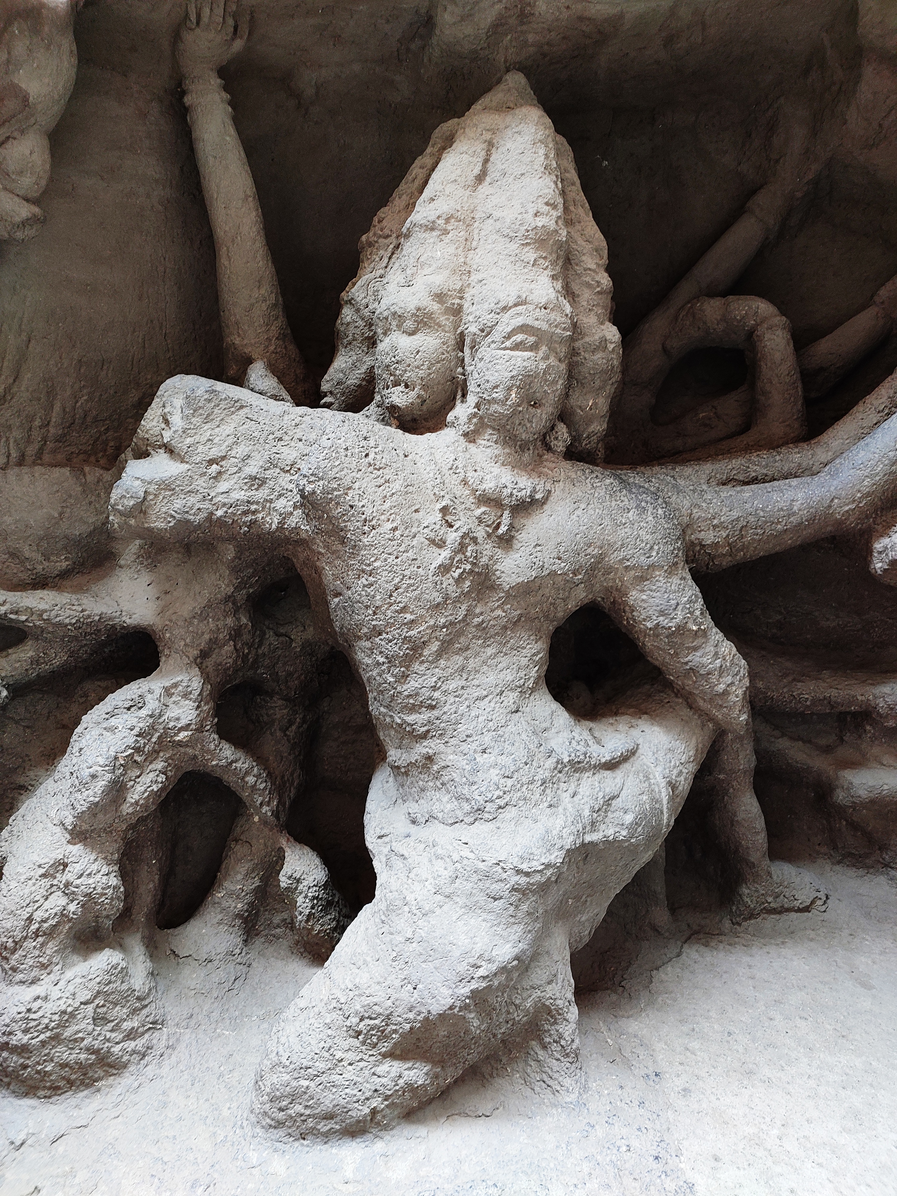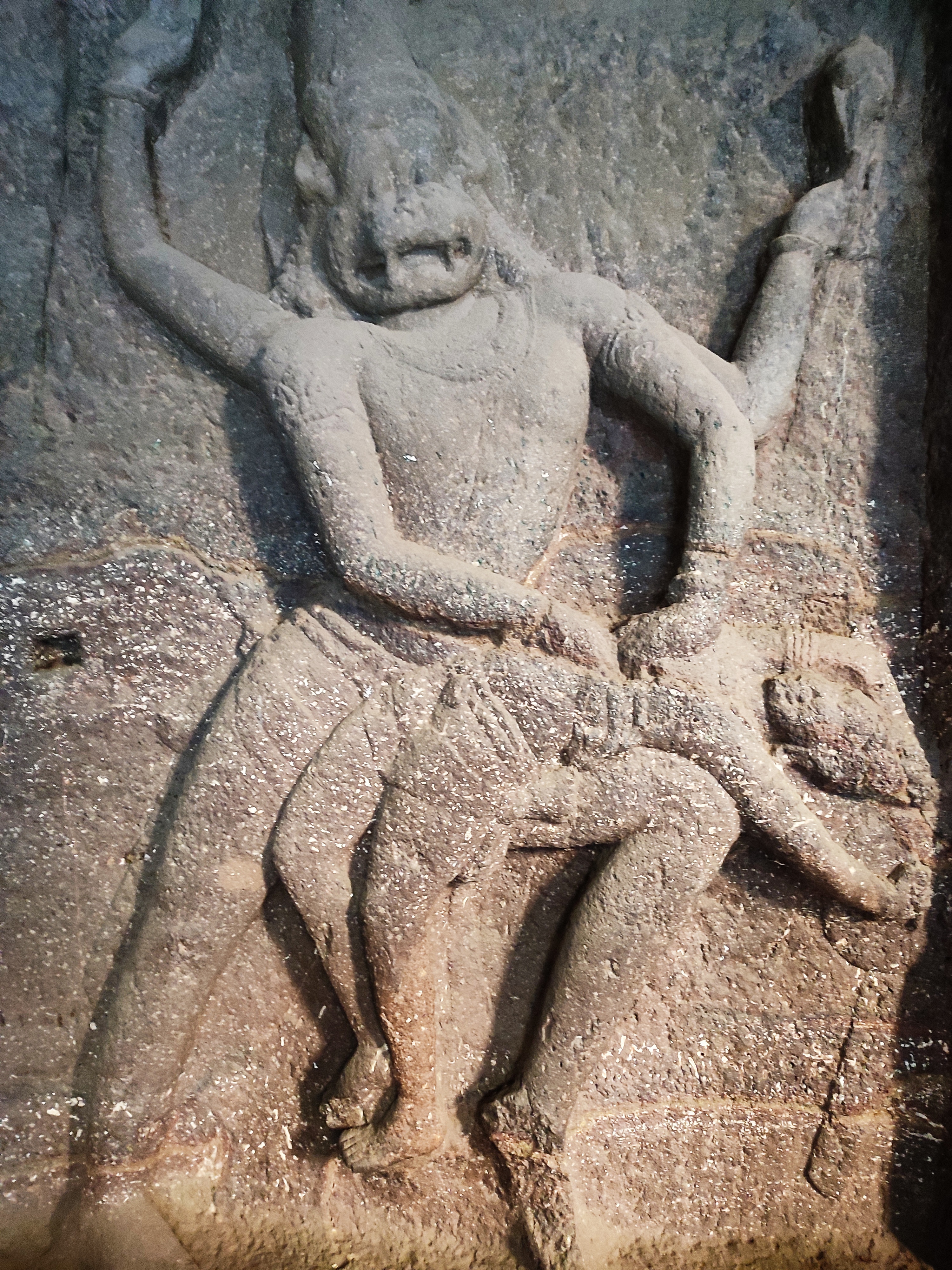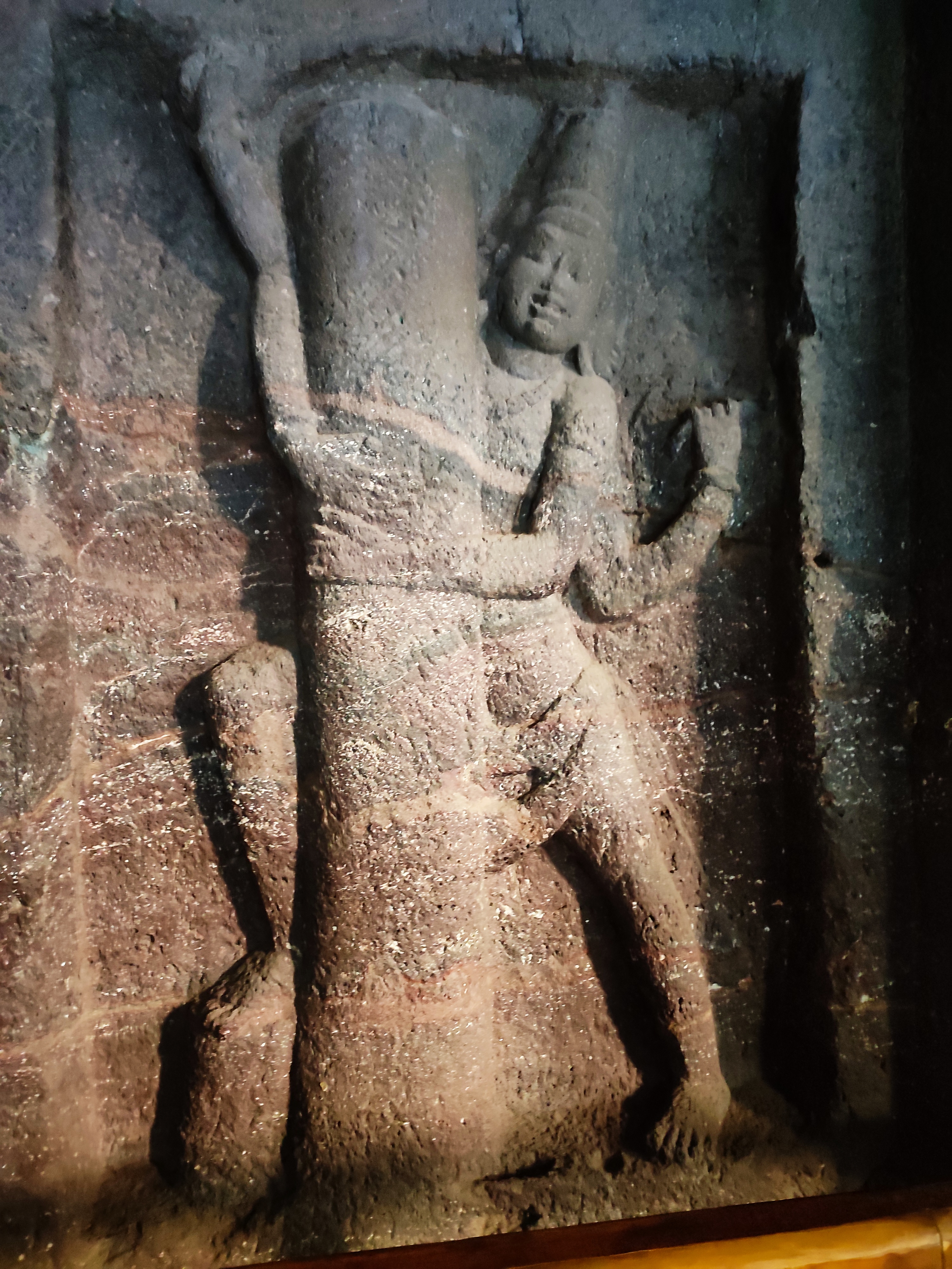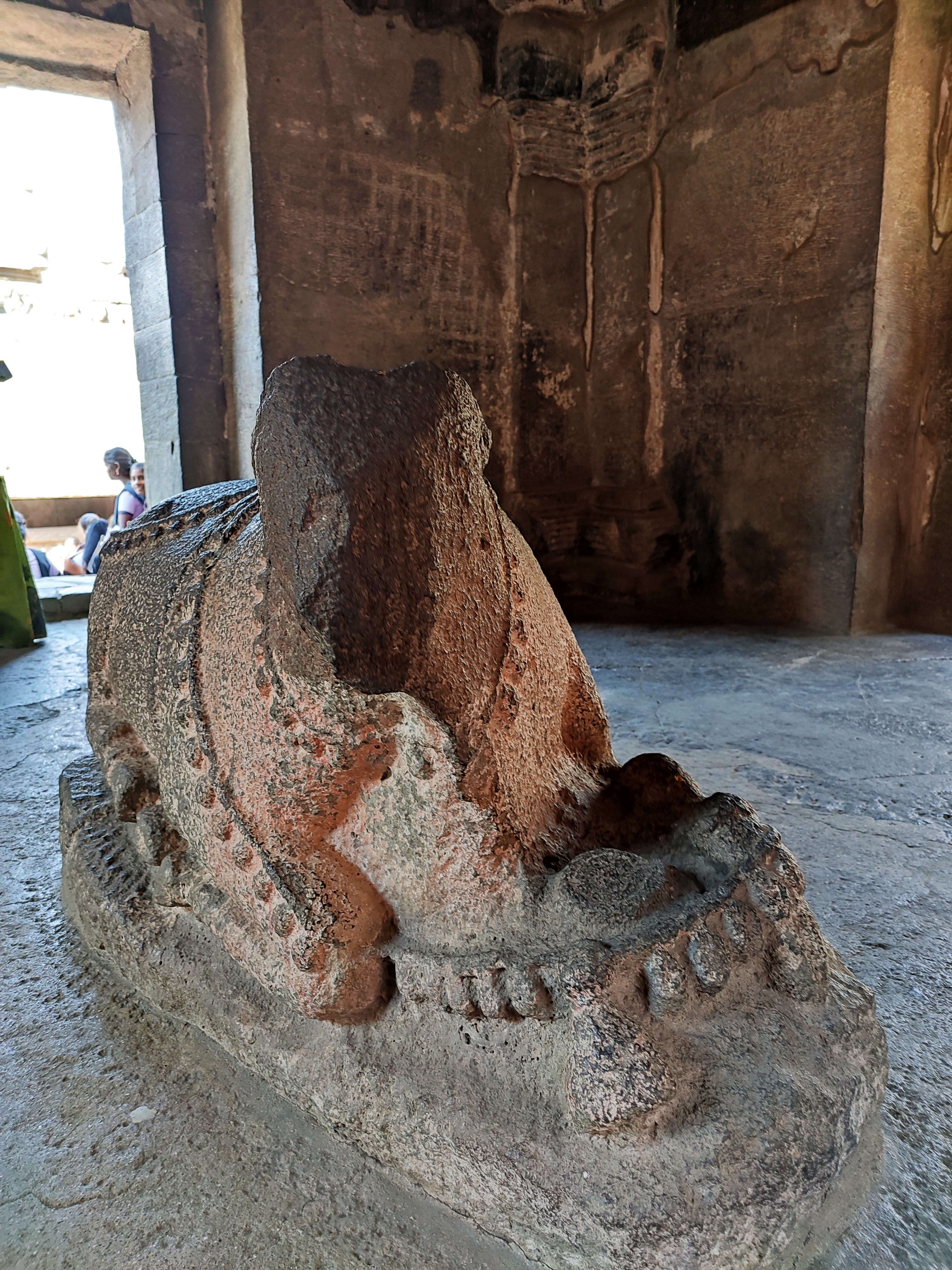 Coming down the steep steps , we now looked at walking through the enclosed corridor on the sides of the courtyard. A few steps above ground level, and the corridor is a literal museum, with carvings and sculptures depicting scenes from ancient epics, including the Dashavatar. Yes, the Dashavatar in a Shiva Temple, goes to show the kind of respect for cultural practices different from theirs.