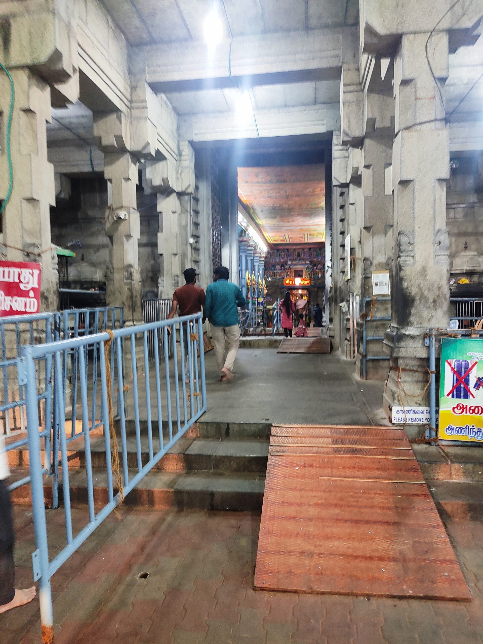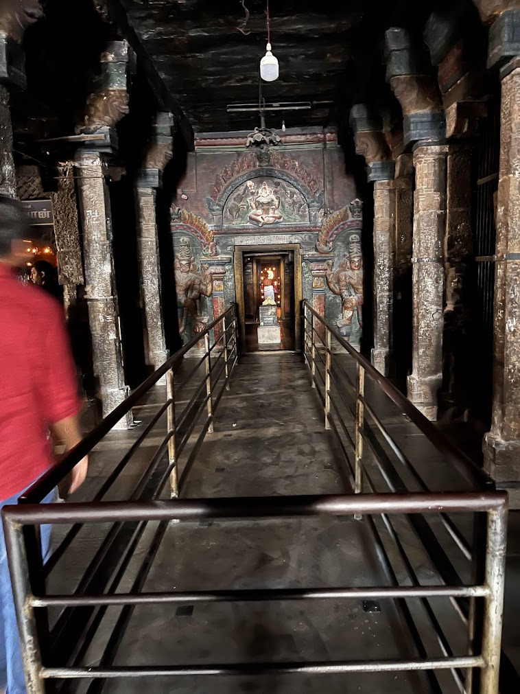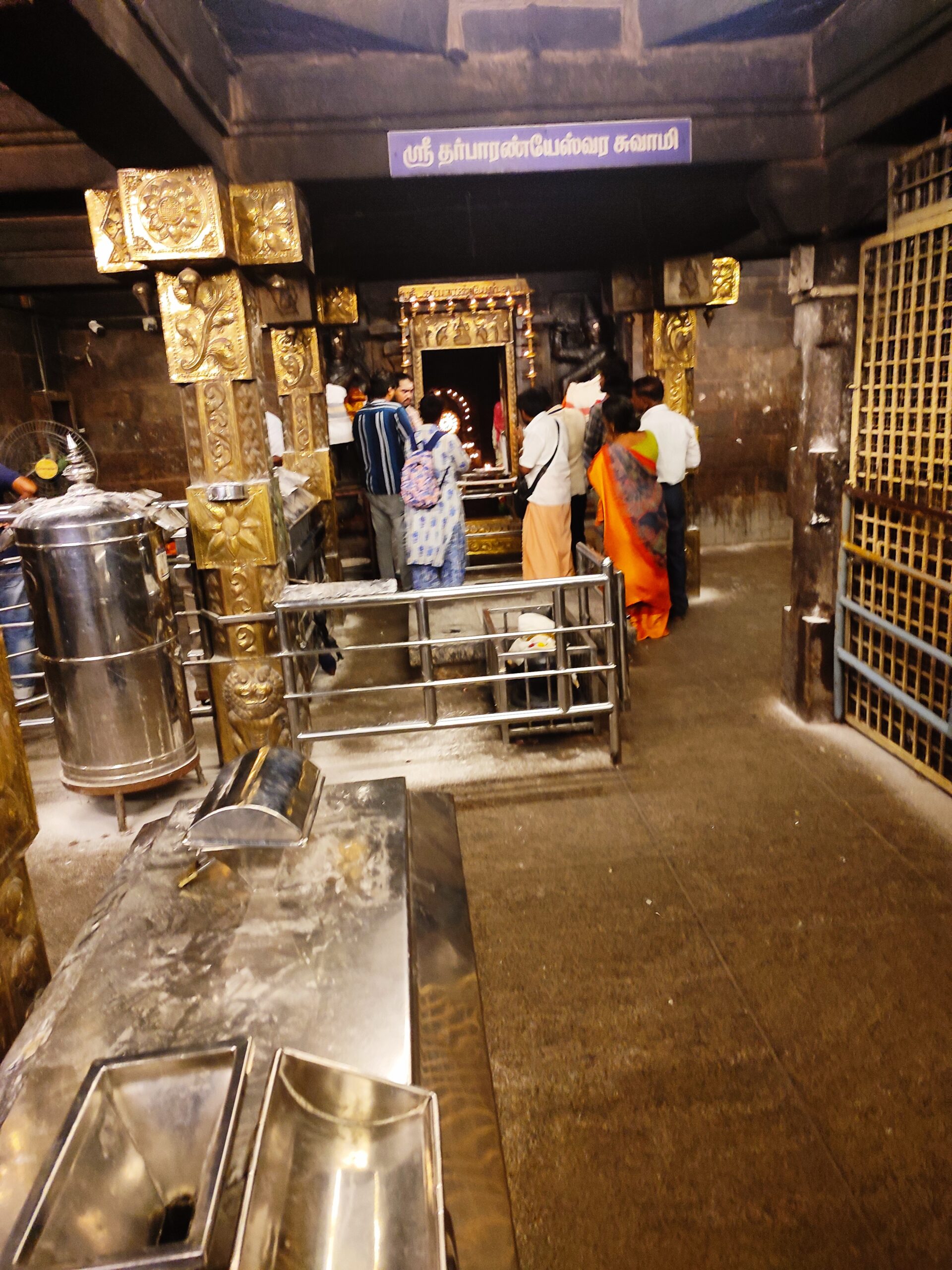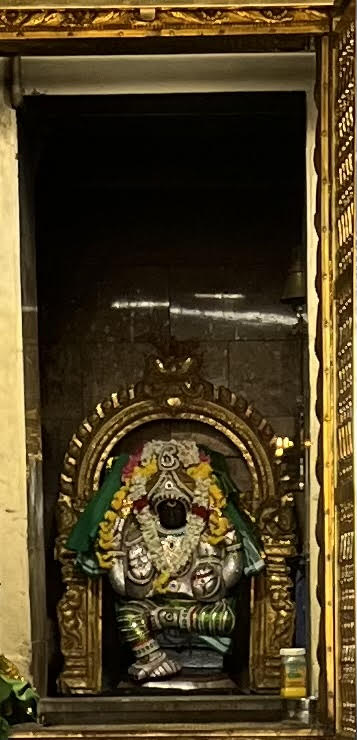 Next was the shrine of Elavarkuzhali, the consort of Apathasahayeswarar. There is no special shrine for Guru Bhagwan as such, and He is worshipped as Dakshinamurthy, a form of Shiva Himself. As per Vedic astrology, Guru or Brihaspati, governs knowledge, wisdom, wealth, children, marriage and spirituality ……. that is every aspect of life. Hence, on every Thursday as also on days when Guru transitions from one zodiac sign to another, the temple sees massive crowds. as was evident from the long barricades created for queues. Not much crowd when we visited, on a Sunday. Devotees offer yellow colored cloth and chana dal to Dakshinamurthy.