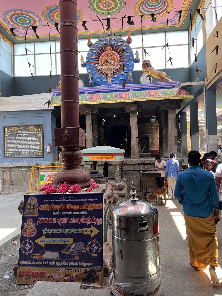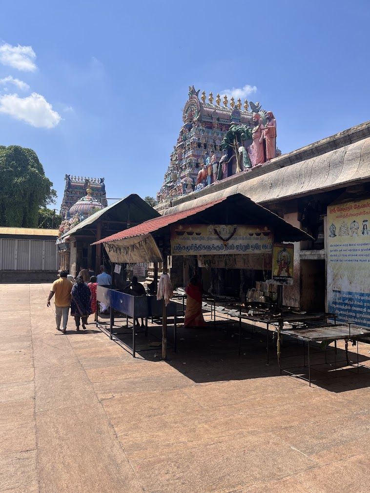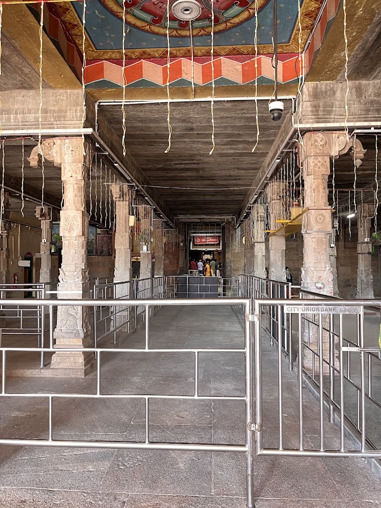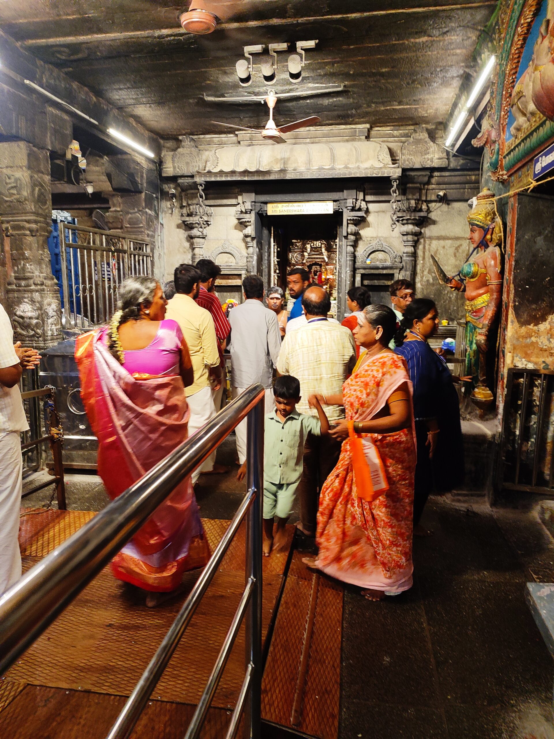 Next was the shrine of Elavarkuzhali, the consort of Apathasahayeswarar. There is no special shrine for Guru Bhagwan as such, and He is worshipped as Dakshinamurthy, a form of Shiva Himself. As per Vedic astrology, Guru or Brihaspati, governs knowledge, wisdom, wealth, children, marriage and spirituality ……. that is every aspect of life. Hence, on every Thursday as also on days when Guru transitions from one zodiac sign to another, the temple sees massive crowds. as was evident from the long barricades created for queues. Not much crowd when we visited, on a Sunday. Devotees offer yellow colored cloth and chana dal to Dakshinamurthy.