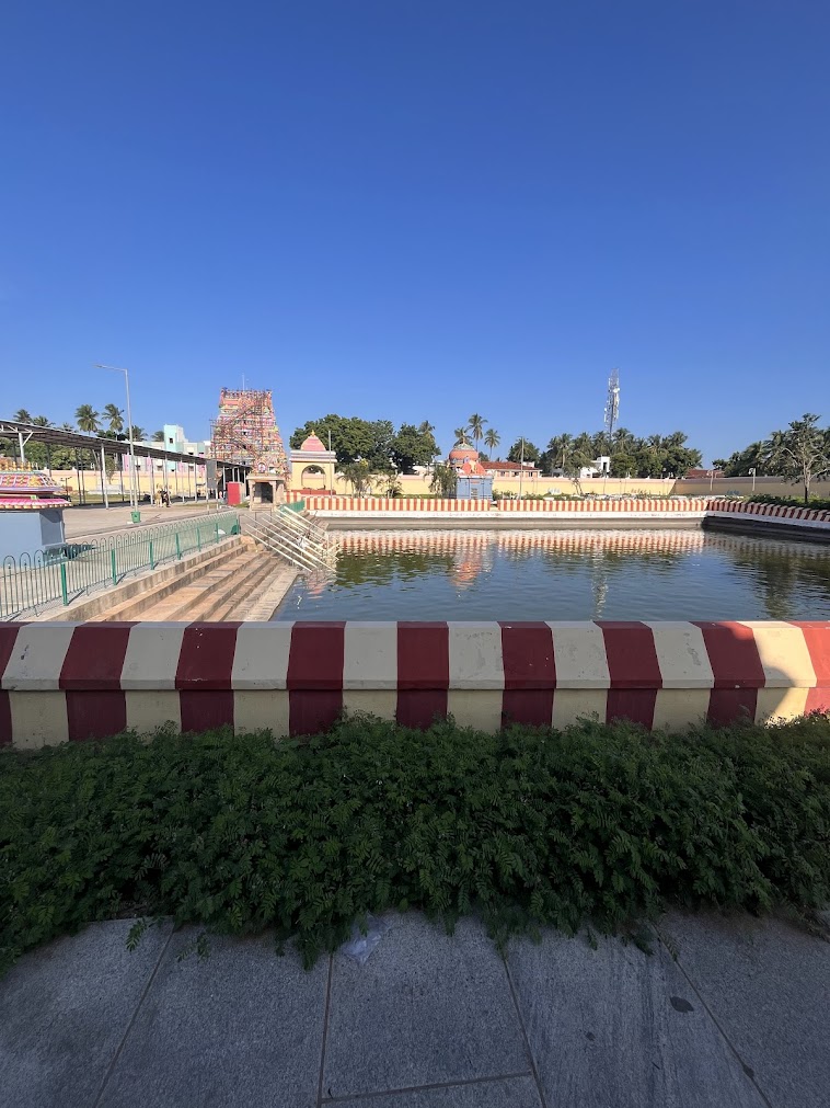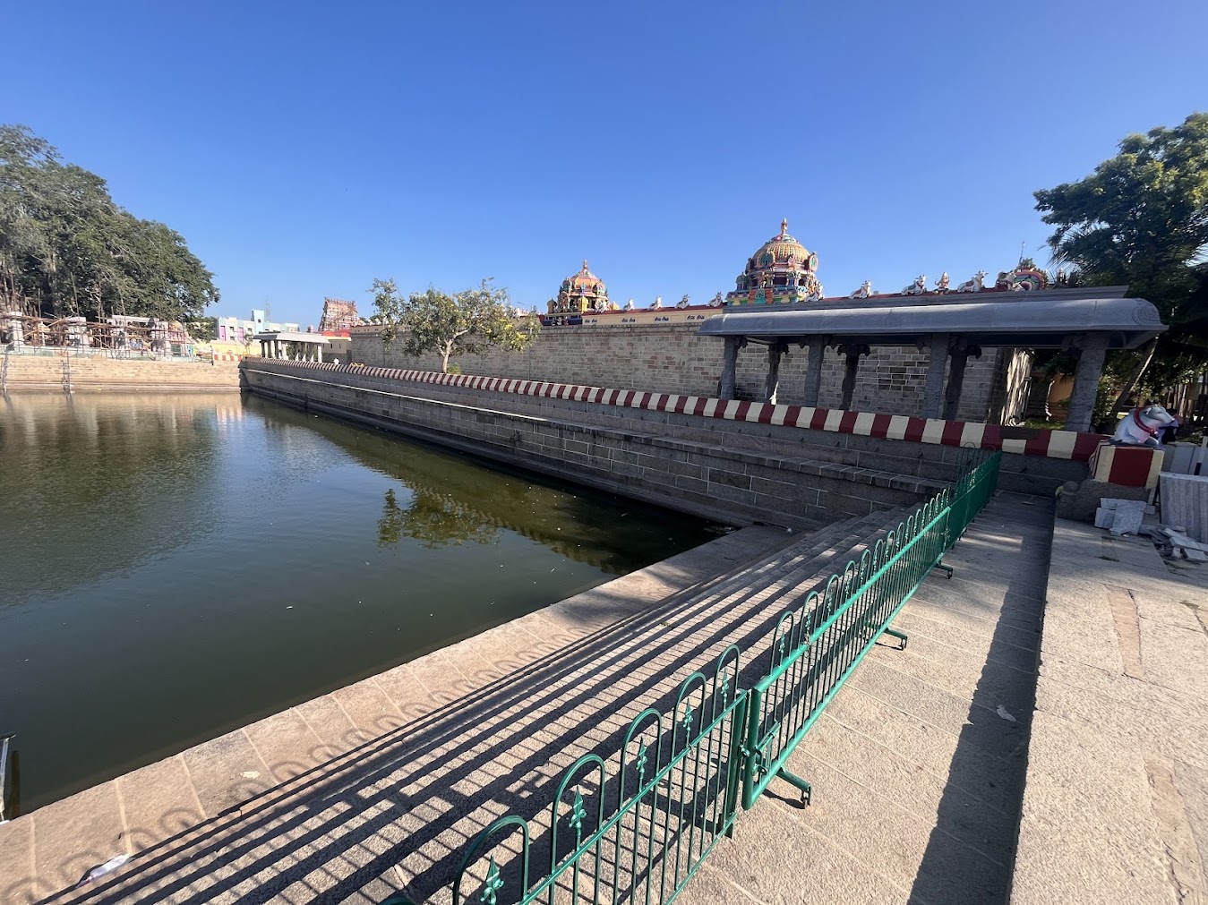 We ventured inside and walked around the temple complex as we awaited the darshan by 4 PM. Easily the prettiest temple, we had seen today and by far one of the largest. What struck us most was the cleanliness and the huge water bodies inside. The place was originally known as Swetharanyam and since the Swayambhu shivling was found here, Shiva is worshipped here as Swetharanyeswarar and His consort is Brahmavidyambigai. This is another of the Paadal Petra Sthalam. Legend has it that there was an asura named Maruthuvasuran, who on getting a boon from Brahma started troubling everyone. Finally, Shiva revealed His angry face of Agoramoorthi and slayed him. In this temple there is a separate shrine for Agoramoorthi as well. Another shrine is that of Nataraja, the cosmic dancer. It is said that Shiva performed the tandava for the benefit of sage Agastya here, even before dancing at Chidambaram. Hence, another name for this place is Adi Chidamabaram.
