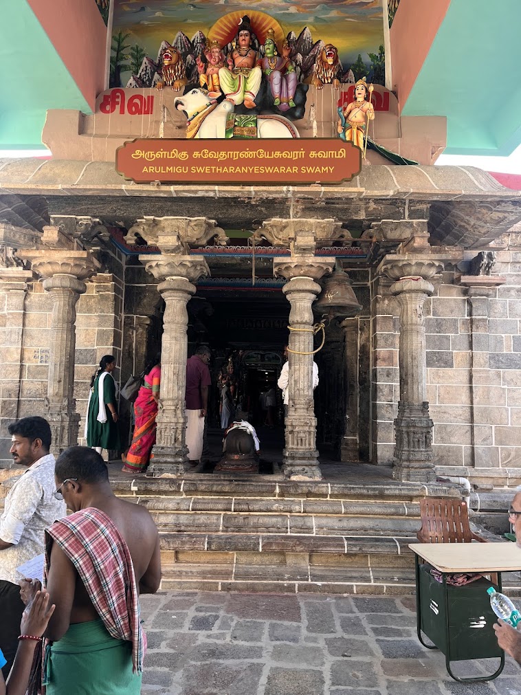 One factor that people doing the one-day Navagraha tour should take into account is the fact that most temples, close between 12 and 1.30 PM and then reopen by 4-4.30 PM only. How does one utilise the time in between? Some come back to their place of stay in Kumbakonam for lunch and rest after five of the Navagraha temples and then start for the afternoon session. Being Sunday, Vaitheeswaran Koil will be open till 1.30 PM and we could make a dash for it before lunch, informed our driver, So we raced along the main road before getting into the town that bears the same name, Vaitheeswaran Koil. This temple has a shrine for Sevvai or Angaragan (Mars). Unlike many of the other Navagraha temples, here Shiva as Vaidhyanathar is more popular and devotees throng the temple seeking good health. Vaidyanathar, literally means Lord of Medical treatment or a Doctor. His consort is called Thayal Nayaki, the one who provides the thayilams or native medicine to Vaitheeswaran.