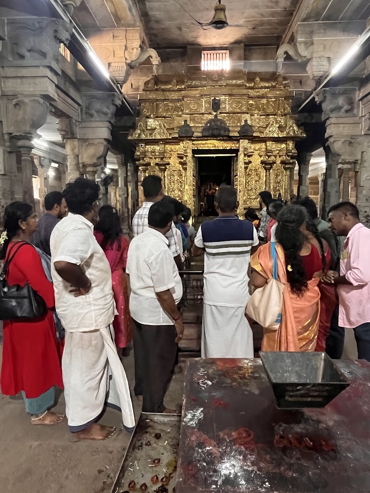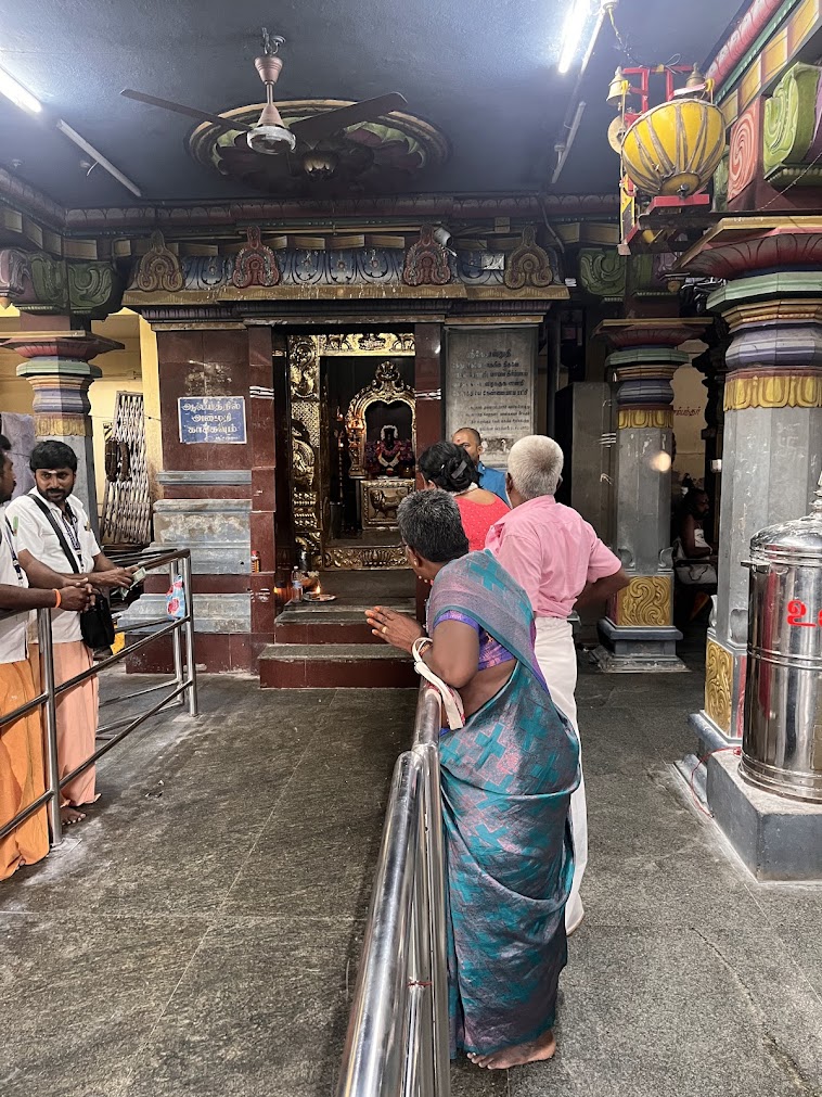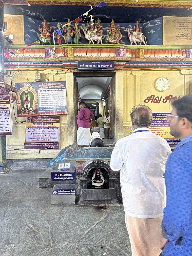 This is the most important Rahu sthalam and anyone with Rahu dosha performs special pooja here. As per Vedic astrology, Rahu is malefic but at the same time rewards people when appeased. Ambitions, desires and challenges are all attributed to Rahu. ‘Rahu kaal’ is supposed to be the most inauspicious time for any new beginnings, including travel. We were told that when milk abhisheka is done in the temple during Rahu kaal, on the idol, the milk turns blue. Legend is that when Vishnu as Mohini was distributing Amrit to the Gods, Rahu who was demon, surreptitiously sat between the Sun God and Moon God. As soon as Mohini had served a drop of Amrit, the Sun and Moon pointed out that Rahu was an intruder. An enraged Vishnu took out his chakra and sliced off Rahu’s head. The lifeless body became Kethu but, as he had tasted Amrit, the head that had disappeared acquired some powers. To this day, Rahu’s enmity with the Sun and Moon remain intact, as he swallows them during eclipses. The Rahu shrine shows Rahu with his two wives, Nagavalli & Nagakanni. Good darshan, but no pictures.