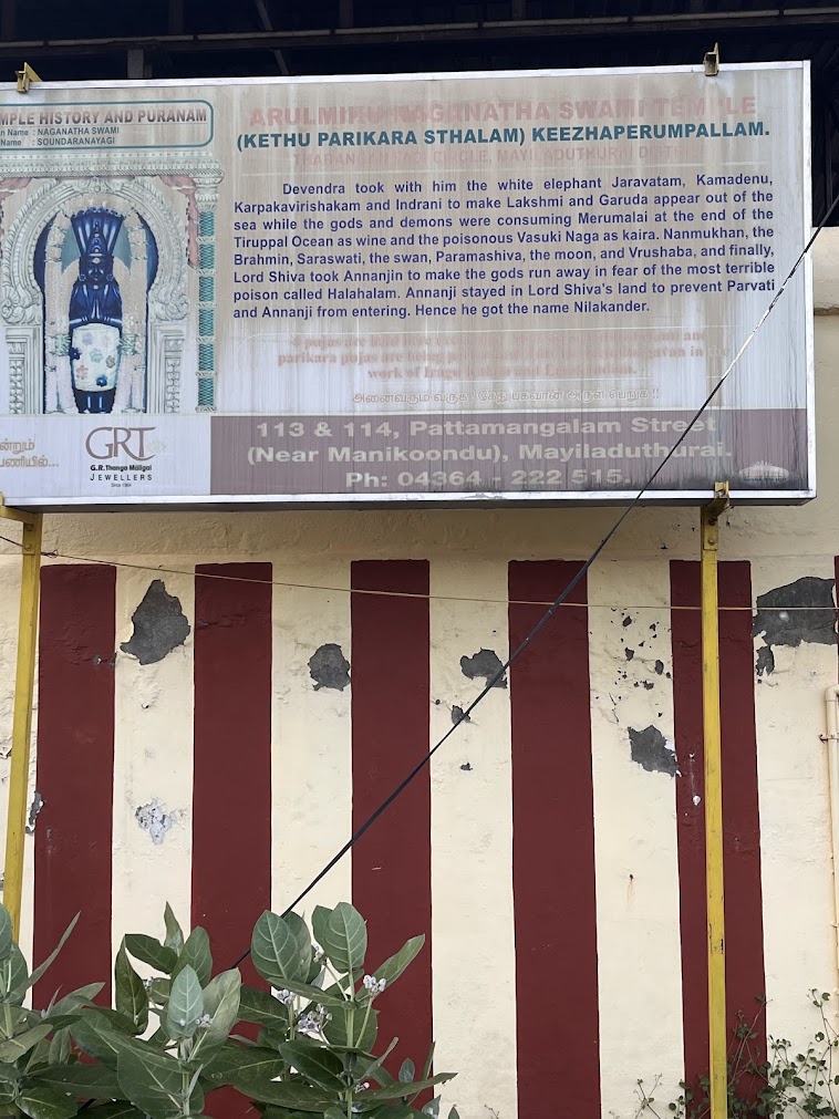 Legend has it that when the samudra manthan was on and Vasuki emitted poison and poisonous fumes all round, Shiva as Apathasahayeswarar, swallowed the poison at Alangudi, to save all living beings. Vasuki, ashamed of his mistake is said to have prayed to Shiva at Keezghaperumpallam and a pleased Shiva, as Naganathaswamy blessed him to stay here. Kethu has a separate shrine here and people with Kethu dosha visit here to perform special poojas.