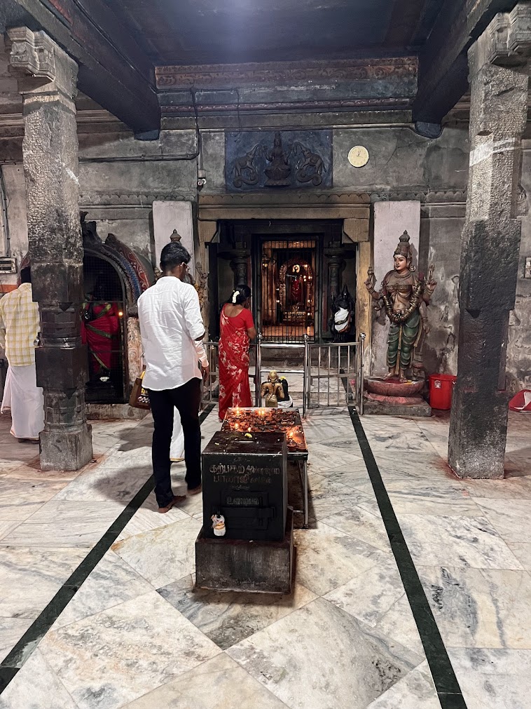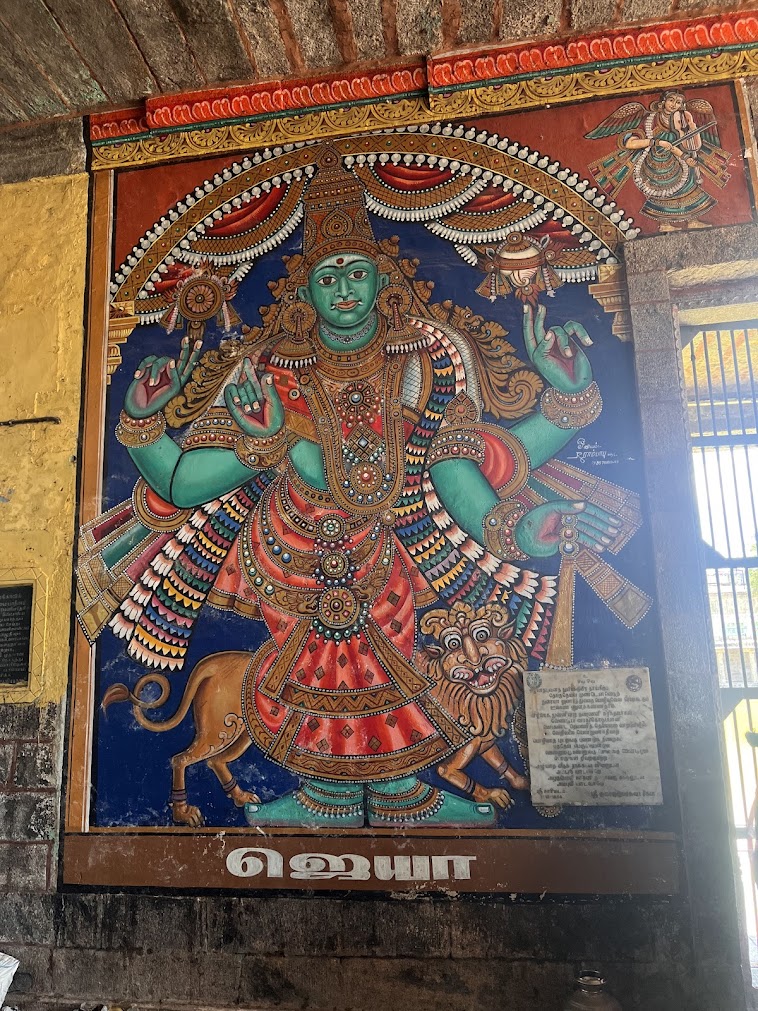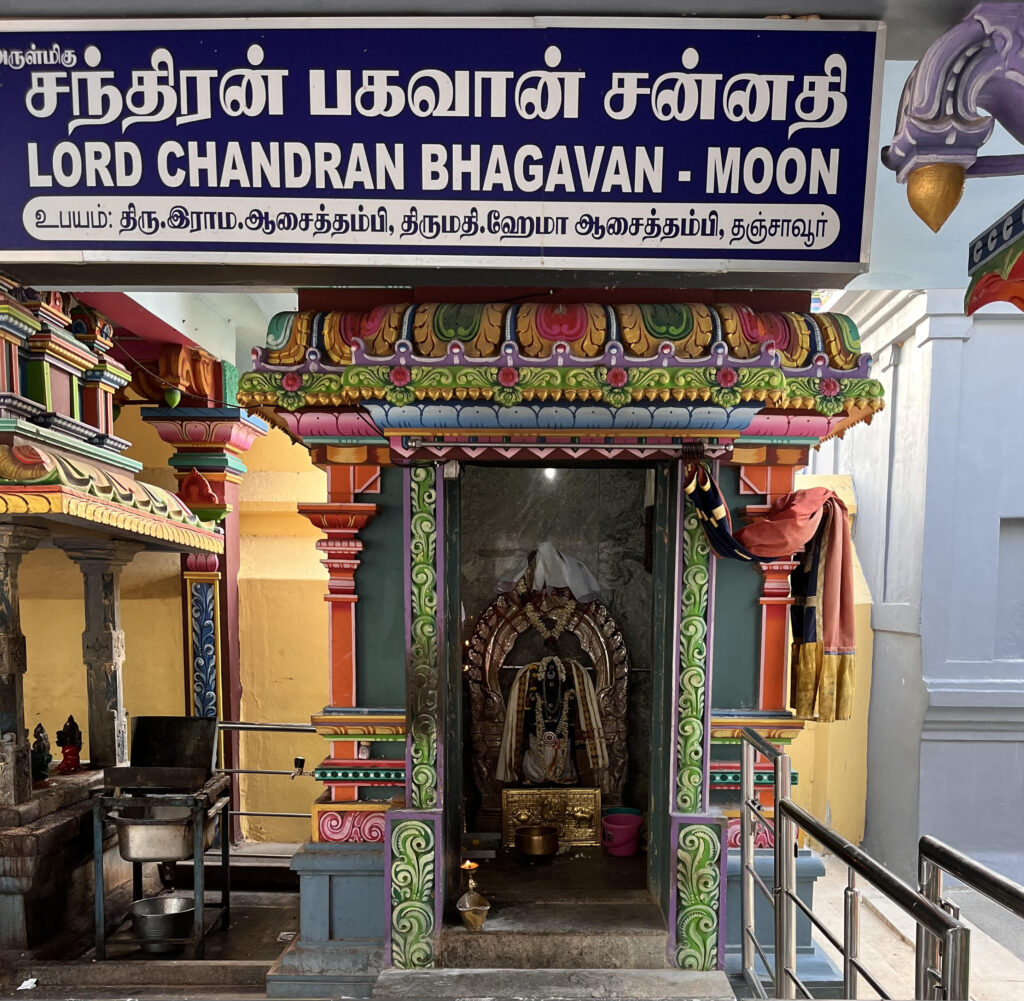 Very few people at the temple at this time. We prayed to the presiding deity Kailasanathar in lingam form and then to His consort, Periya Nayaki. After this only, we are supposed to go to the shrine of the Navagraha, which in this case was Chandran, Soma or the Moon God. Legend has it that Chandran had married the 28 daughters of Daksha but, he gave undue attention only to the youngest one. Infuriated, the other daughters complained to their father Daksha, who cursed Chandran to lose all his powers and sheen, Chandran prayed to Kailasanathar at this very place and regained his powers. This temple is said to have been built by the early Cholas, but its present structure was put up by the Nayaks. People pray here for mental peace, emotional stability and hiccups before/in marriage.
