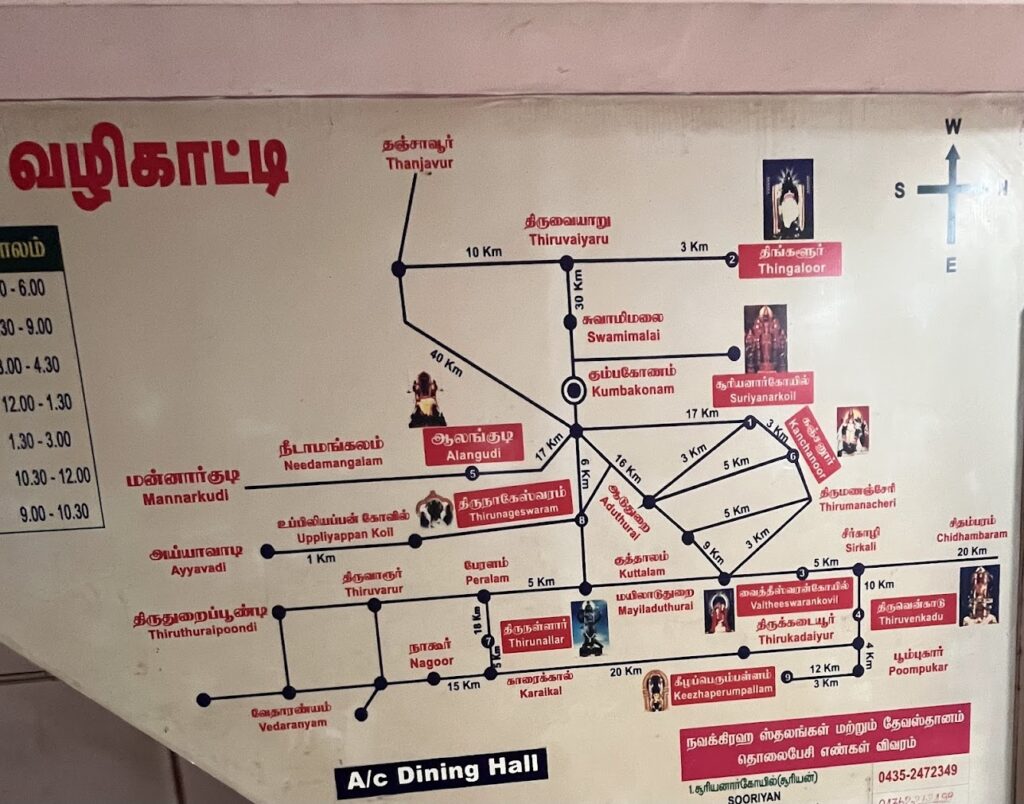 The above map showing the 9 Navagraha sthalas was found in a small eatery where we had our breakfast and, I thought it serves as the best guide. First things first — The 9 Navagrahas can be covered in one say, but if people desire propitiating some of the Navagrahas with elaborate poojas, it can take 2 days, with the trip being broken up. We opted for the day trip, paid Rs.4500 for the cab and off we went. The Tamil Nadu State Transport Corporation also runs 1-day Navagraha tours by bus but, this is only on Sundays.