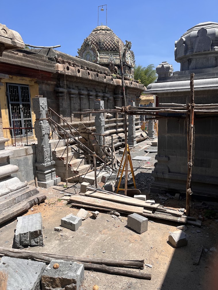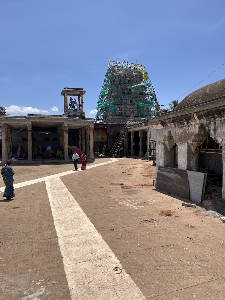 Around 11.10 AM. We had reached Aduthurai but, our driver in order to avoid parking charges in front of the temple, parked the car on the main road and asked us to take a short walk through a shaded lane right to the temple. A 3 -minute walk and we were looking at the Suryanar Kovil gopuram that was undergoing renovation/restoration. As we stepped inside the temple, we could see renovation work being carried out there too.