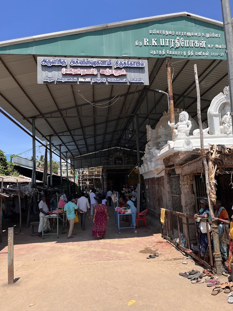 The temple built during the reign of the Medieval Cholas and later expanded by the Vijayanagar kings has many legends associated with it. It is said Shukracharya, the guru of the asuras, used the Mritasanjivanai mantra to bring back to life all the slayed auras, so much so that the Devas were always outnumbered and could never defeat the asuras, The Devas took refuge here in Kanjanur and pleaded with Shiva to help them. Shiva invited Shukracharya to the spot where the temple stands and, swallowed him alive. Shiva as Agneeswarar is worshipped in this temple with Shukracharya inside Him. Another legend says that Agni worshipped Shiva here and hence He took the name Agneeswarar. Brahma is said to have witnessed the celestial wedding of Agneeswarar and Karpagavalli here. The sage Parasara is also said to have witnessed Shiva’s cosmic dance in this temple.