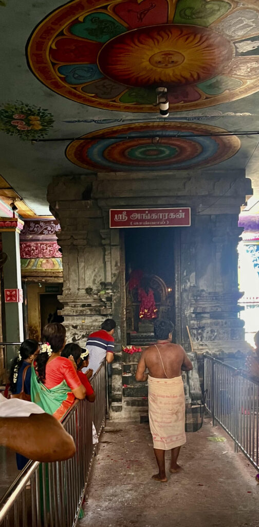 It was close to 1.20 PM and there was a fairly large crowd in the temple, with many people after darshan relaxing in the long corridors. Continuing with the legend, who did Vaitheeswaran cure? Angaragan or Mars was afflicted with leprosy and after he prayed here and had a dip in the temple tank, he was cured. Also , this is the location where Parvati had given a Vel or spear to Her young son, Karthikeya ( Murugan) to fight with the demon Soorapadman. Sure enough, Karthikeya vanquished the demon and hence He is worshipped in this temple as Bala Muthukumaraswamy. During the battle, many in his army were injured and Vaitheeswaran is said to have treated them. Rama and Lakshmana are said to have prayed at this location. The sanctum of Vaitheeswaran faces west, unlike in most Shiva temples where it faces east. Angaragan has a separate shrine and people with Sevvai dosha that is said to come in the way of marriages, throng the shrine to offer special poojas. Moreover, the entire town of Vaitheeswaran Koil is renowned for ‘Jeeva Nadi astrology’, where ones past, present and future are read from ancient scripts written on palm leaves. Many nadi josiyam centers abound in this town. We had a quick darshan of Vaitheeswaran, Thayal Nayaki and of course, Angaragan, apart from Dhanavantri, who too has a separate shrine. Something unique is the Navagrahas positioning in this temple. They are all in a straight line unlike in other temples, where the nine grahas look in different different directions.