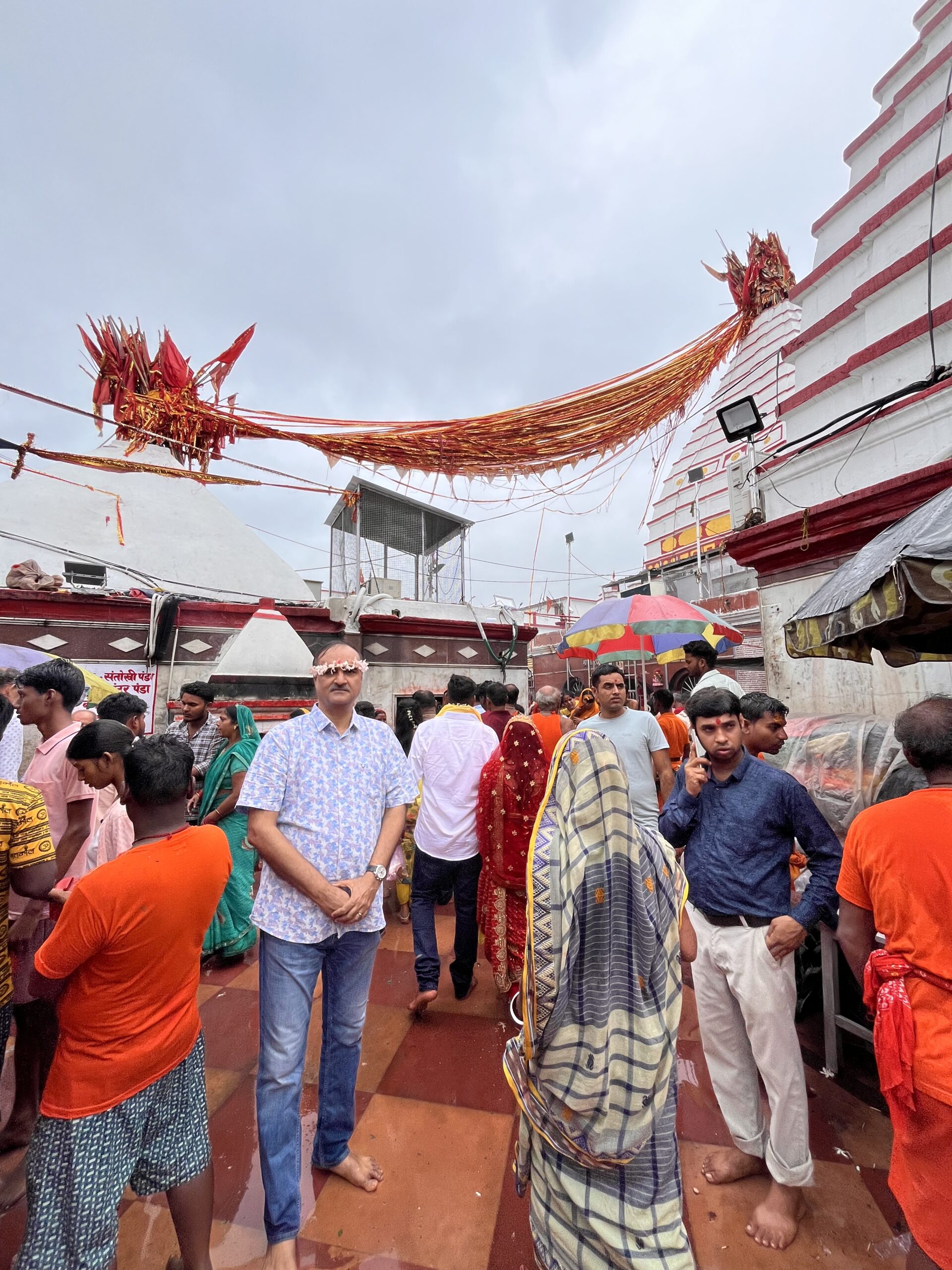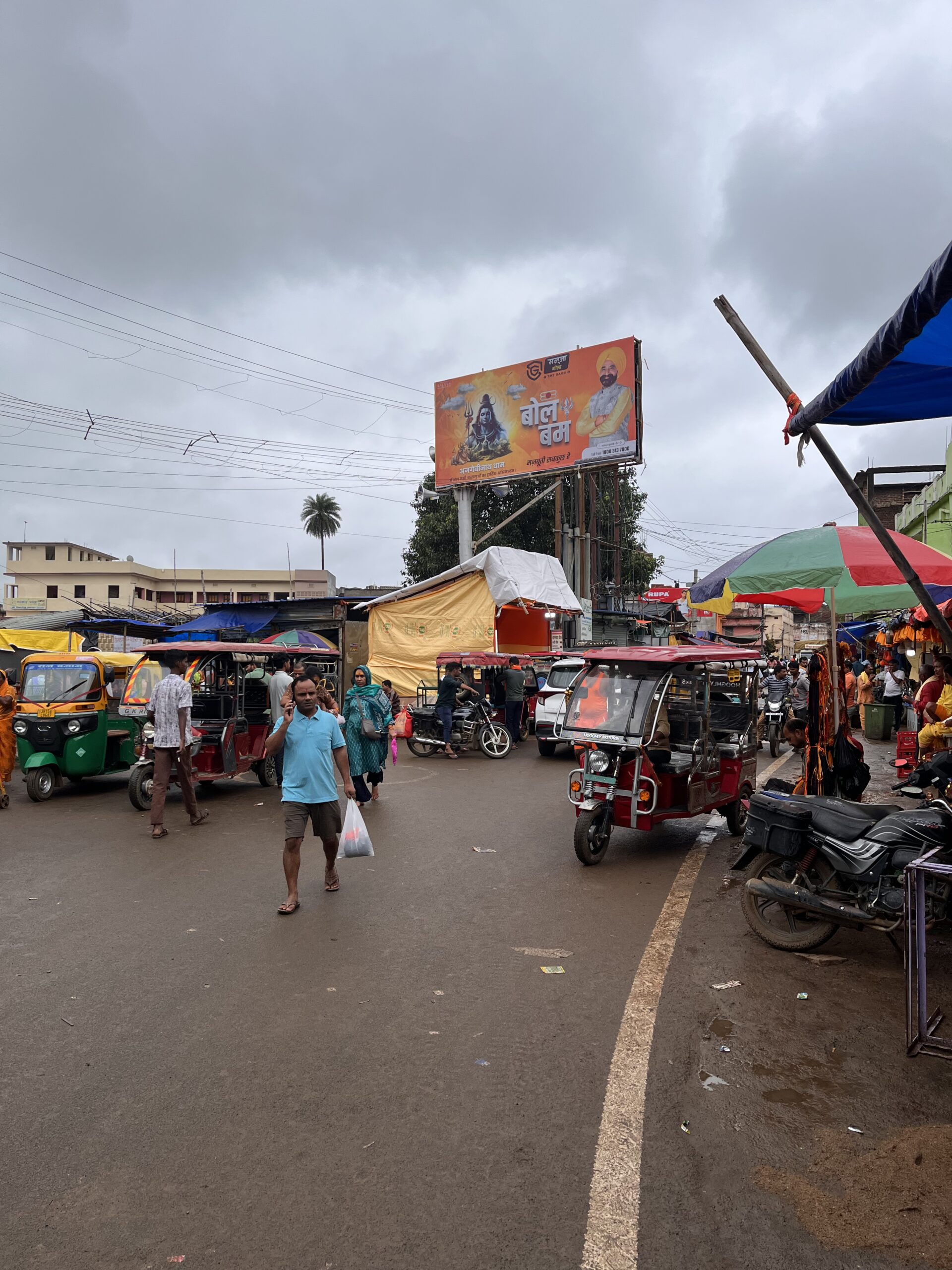It was a very long wait in the rain. We could see the groups of ochre-robed kanwars carrying Ganga Jal in pots slung over their shoulders, circumambulating the main temple with chants of ‘Bol Bam’, ‘Bol Bam’.