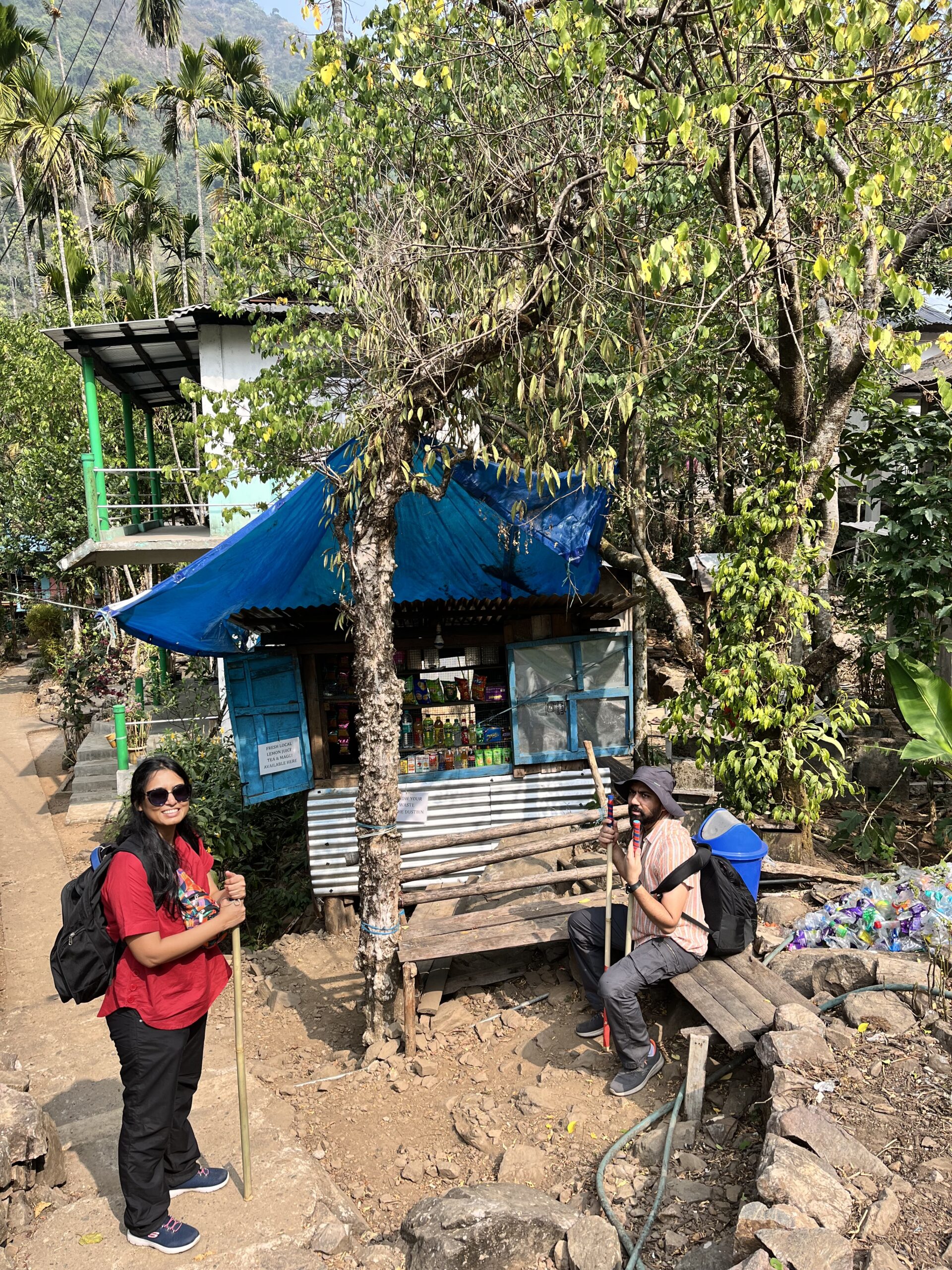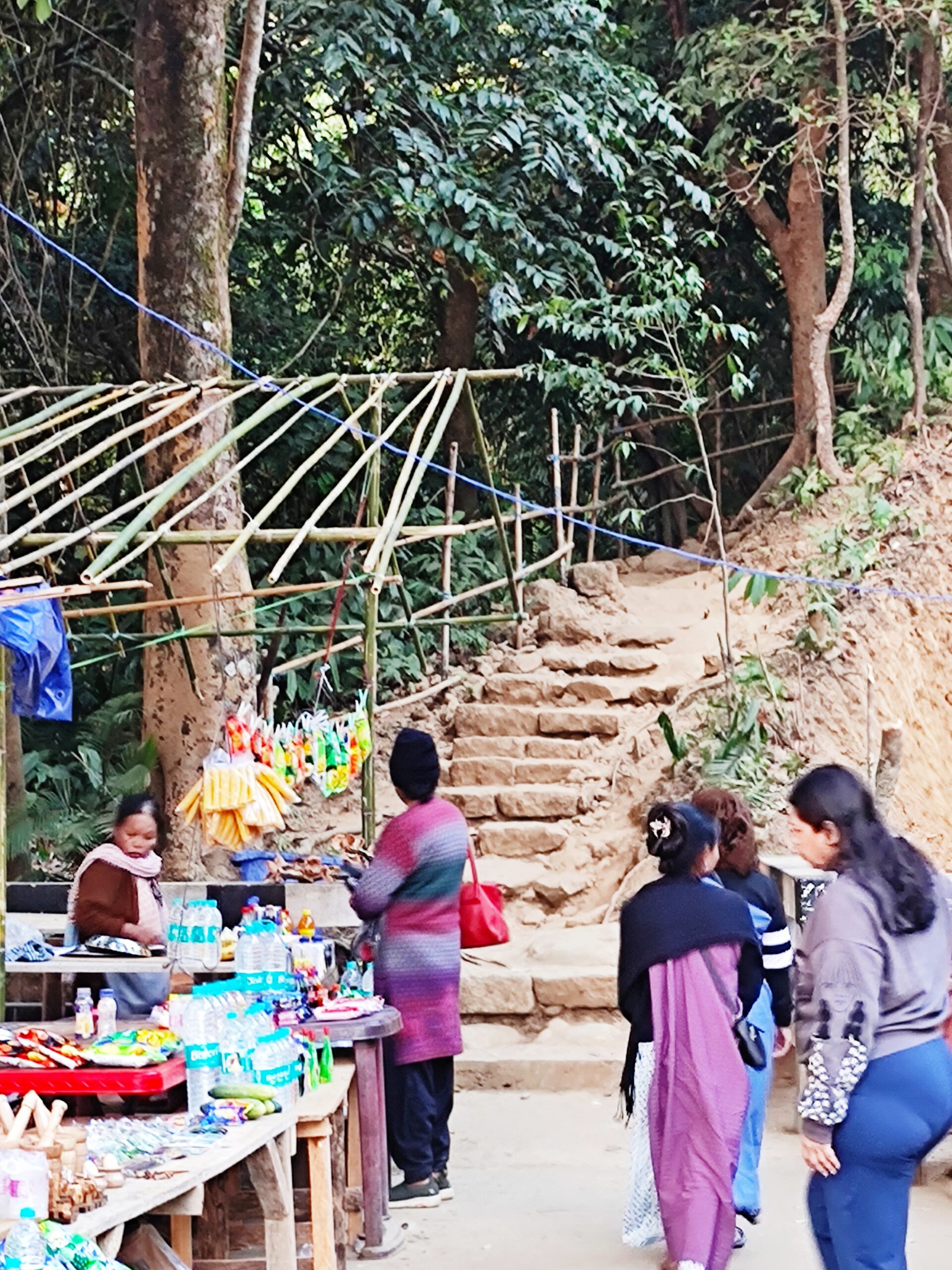 En route one small steel bridge has been closed and, hence we had to walk on the dry stream bed. I slipped and when I tried getting up, legs felt like jelly. Some nearby guides advised me to return. As I was back on my feet, I said, let’s move further. Now the path took a steep upward route with long flights of steps, apart from crossing a steel bridge on the way.