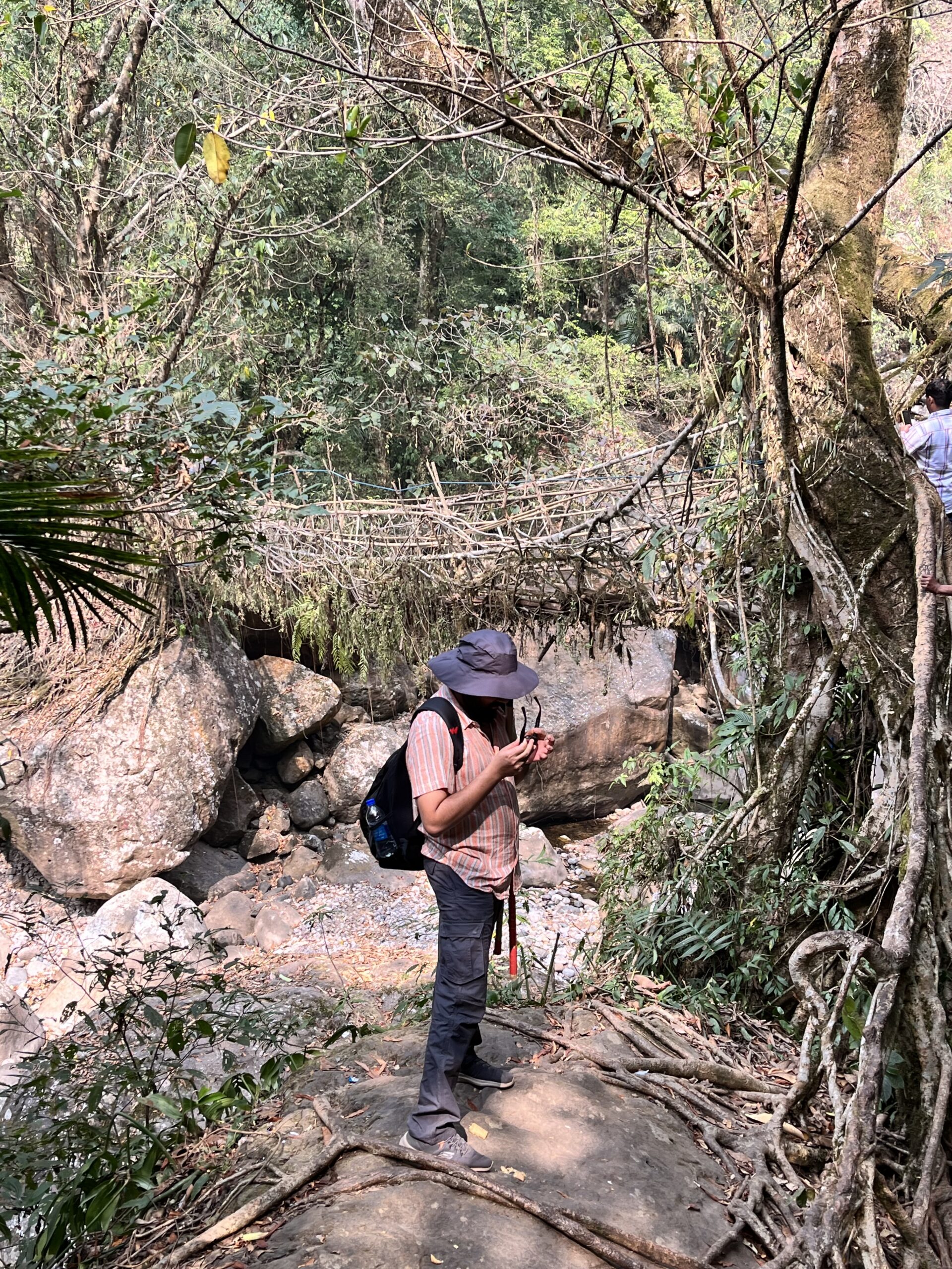 The Mawlynnong root bridge, also called Jingmaham Living Root Bridge in Mohwet village is over 150 years old, yet it was opened for the public as a tourist spot in 2016 by the Princess of Thailand. The bridge is around 30 meters long and the short hike of around 300 meters is easily doable even by small children, though the ground is a bit uneven at some places. Enjoyed the walk on the root bridge, then down to the water below. Excited at our first sight of and walk on a root bridge, we took several pictures and walked back to the car park. Yet, some of our family members felt that this was just a trailer, and the main picture has to be seen …. i.e. the Double decker and long single decker root bridges near Cherapunji.