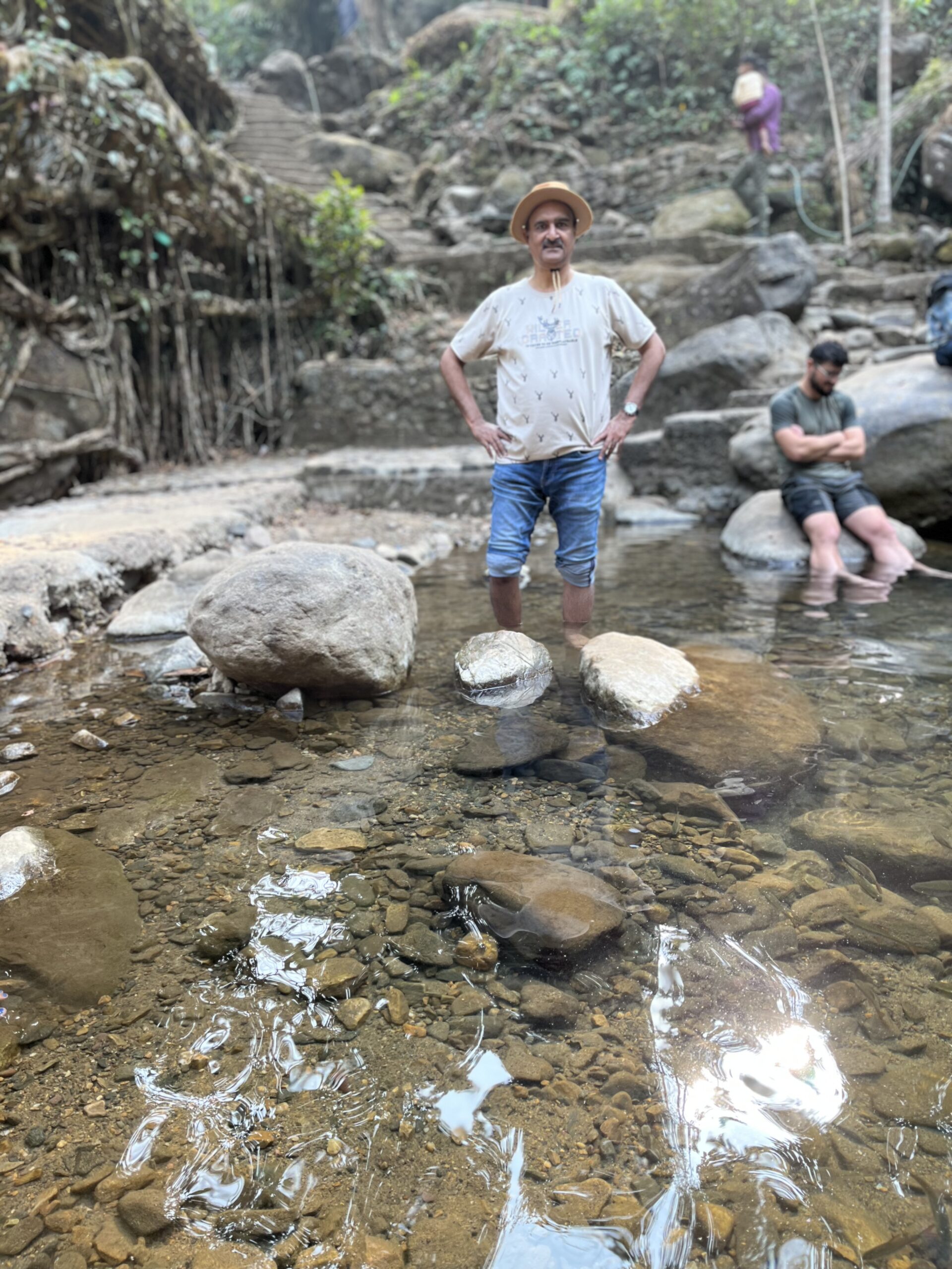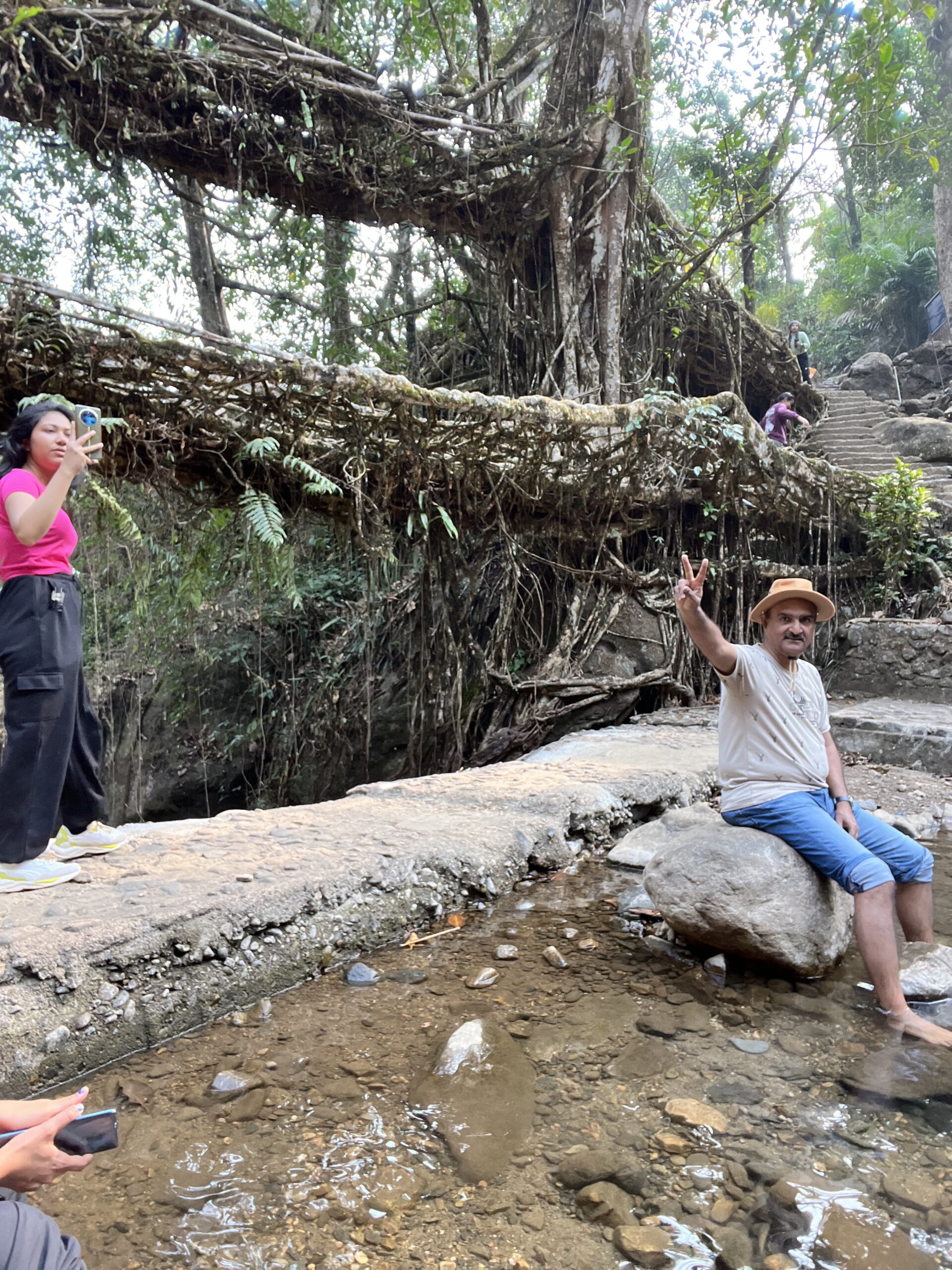 Puffing and panting, soldiered on, and by 1.30 PM (We had started at 11 AM), our eyes fell on the Umshiang double decker root bridge, with a small pool of crystal-clear water in front from a small waterfall. Words cannot describe the feeling, as we watched the amazing engineering skills of the native tribes, before walking along on both the decks of the bridge. Time to cool ourselves in the pool, and it was absolutely relaxing for our tired legs.