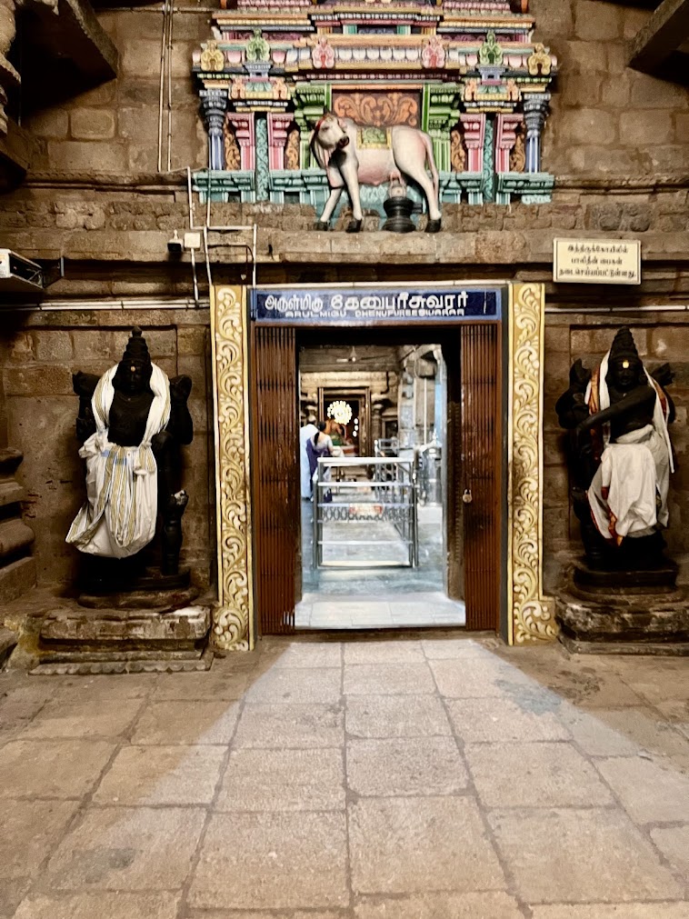 The temple complex is large and there are many legends associated with the temple. It is believed that Patti, daughter of Kamdhenu worshipped Shiva here and so the place came to be called Pateeswaram. It is said, in killing Ravana, Rama committed 3 sins. One of them was the Chaya Hatti dosha because not only was Ravana an exponent of the fine arts, but he was also an ardent devotee of Shiva. Rama is said to have installed the shivling at Pateeswaram and performed abhiseka to absolve Himself of the sin. The Nandi in this temple does not face Dhenupureeswarar directly but is a little away to one side. This, it is believed is because on one hot summer day, when the child poet Tirugnanambandhar came to worship Shiva. Tirugnanasambandhar, being an ardent devotee, Shiva could not wait to see him enter and asked Nandi to move to one side so that they could see each other.