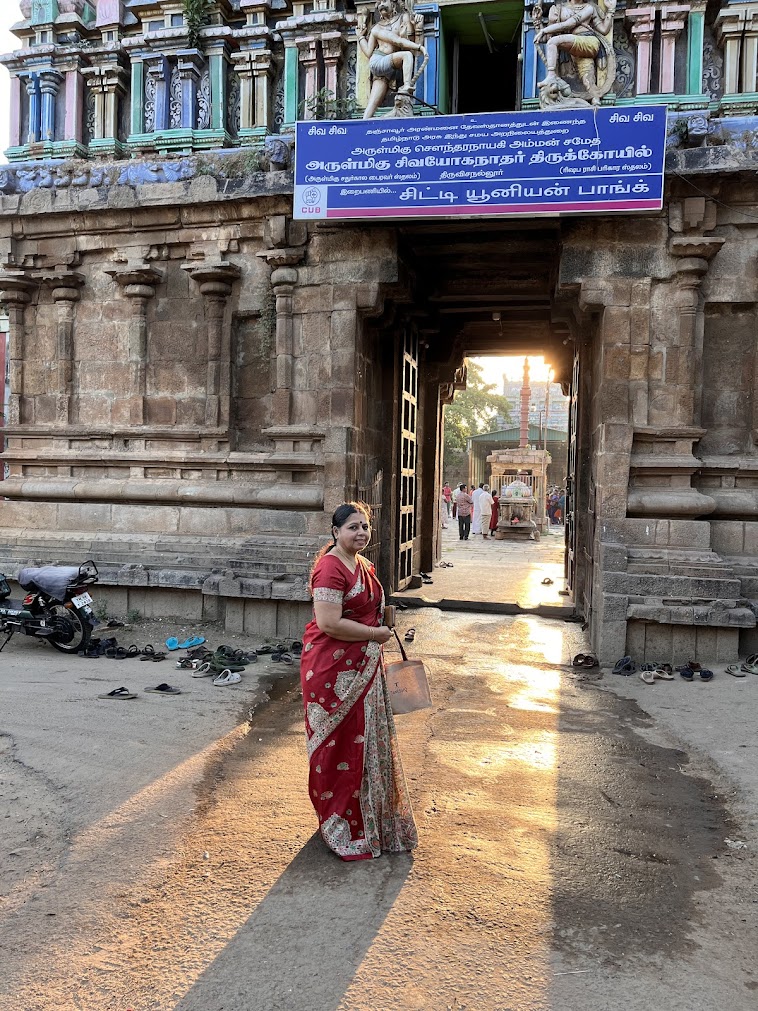 Back at our hotel in Kumbakonam for lunch, a brief rest and in the evening we decided to take an autorickshaw to visit the temple which is special for people with the Rishabha rasi (The Bull, as per Hindu astrology). It is the Sivayoginathar temple in Thiruvisainallur, where Shiva is worshipped in lingam form and His consort is Soundaranayagi. Getting an autorickshaw was an adventure in itself. We first approached an auto driver, who demanded Rs.400 for the up and down trip. Saying No, we walked a little distance and flagged a moving auto, who agreed to ferry us to and fro for Rs.300. Just as we were able to get in, there came the driver out a parked auto and started fighting with this driver, who beat a hasty retreat. Now, the other driver who claimed, he was at the auto stand demanded Rs,500. Th first driver, leaving his vehicle walked over and joined this driver. Saying No, we moved further and took a turn to the main road, where we flagged a passing autorickshaw. The demand was Rs.600. Even as we were signifying our reluctance, the earlier two drivers turned up on foot and there was big quarrel among the three. Meanwhile we walked in the opposite direction, got into an auto for Rs.400 and as we crossed the earlier spot, the 3 drivers were still arguing vehemently and did not even see us. A ride of about 4-5 kilometers and, we were before the Sivayoginathar temple.