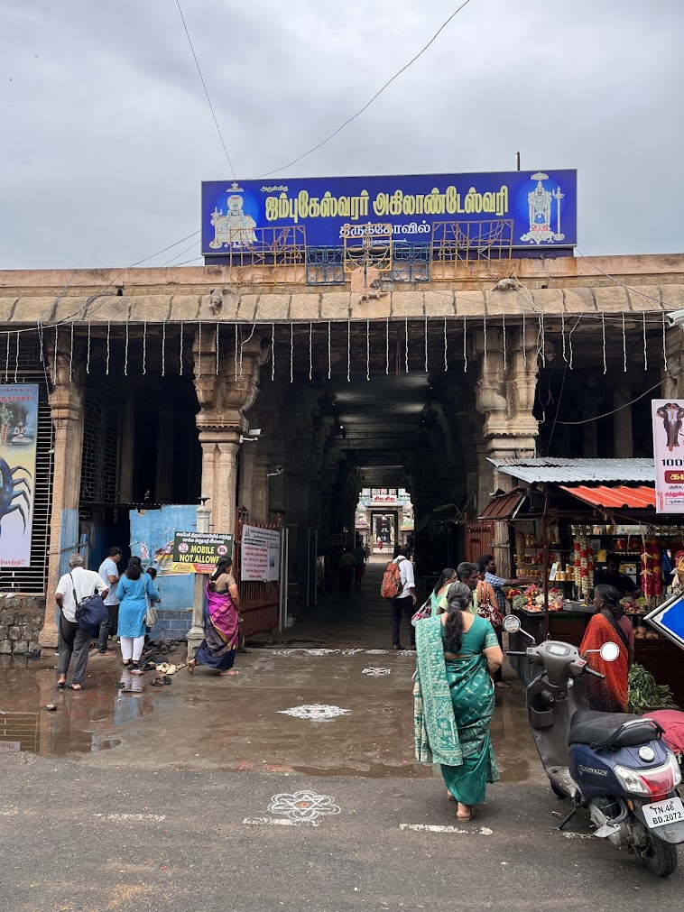 Tiruvanaikaval or Tiruvanaikoil or Tiruvanaika is an ancient Shiva temple said to have been built by Kochengannan Chola, one of the early Chola kings, who had in all built over 70 temples and later attained sainthood. This temple is not only one of the ‘Paadal Petra Sthalam’ but, also one of the five temples where Shiva manifests Himself in the form of different natural elements. The Pancha Bhoota sthalams as tehse are called are: 1) Tiruvanaikaval Jambukeswarar representing WATER 2) Chidambaram Natarajar representing SKY 3) Tiruvannamalai Arunachaleswarar representing FIRE 4) Kanchipuram Ekambareeswarar representing EARTH 5) Kalahasti Kalhasteeswarar representing AIR. An amazing coincidence is that all these five temples representing the five elements are almost in a straight line geographically, even if situated miles apart. Some scientific reasoning, our ancestors knew, that we are yet to decipher.