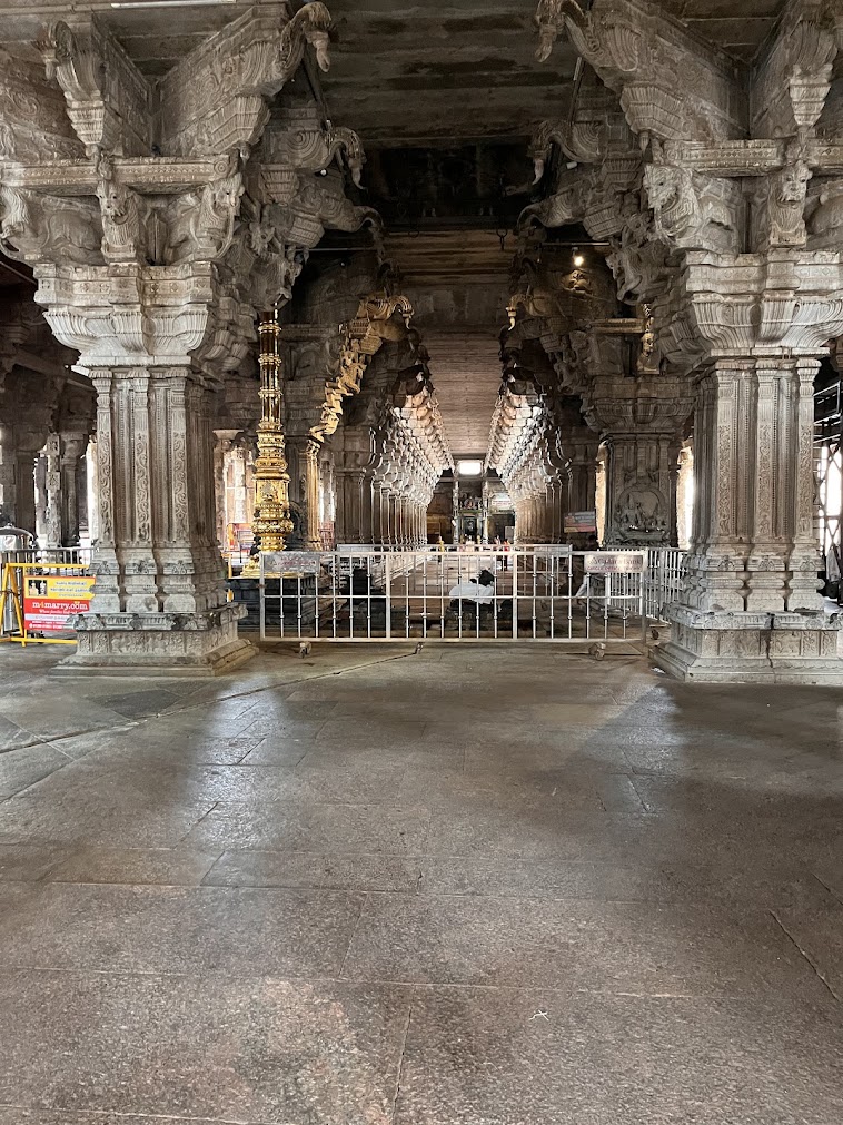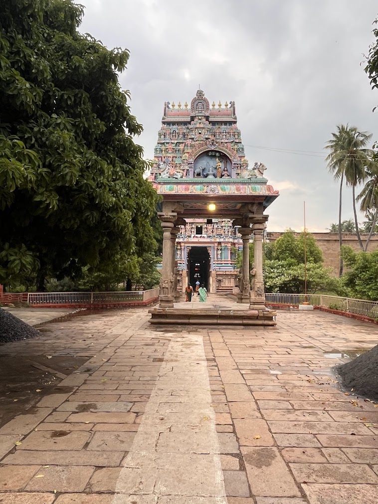 Time now for the sannadhi of Akhilandeswari, the one who lords over the whole world. She is supposed to have learnt many cosmic truths from Shiva Himself. It is believed Akhilandeswari bestows devotees with intelligence and good education, having been a student Herself. It is said that over time, the intense power and splendor created an overwhelming Dharmic force, that worshippers were unable to face. Her sanctum resonated with divine ferocity. Adi Sankaracharya who visited this temple, sought to balance Her ferocity with Her benevolent, motherly form. He did two things — 1) He got an idol of Prasanna Ganapathy, Akhilandeswari’s son installed right opposite Her sanctum, to bring up Her motherly feelings and calm Her down. 2) He consecrated a pair of Sri Chakra earrings ( Thaatankas), of mystical geometric patterns, symbolising the union of Shiv and Shakti, and bringing in harmony.