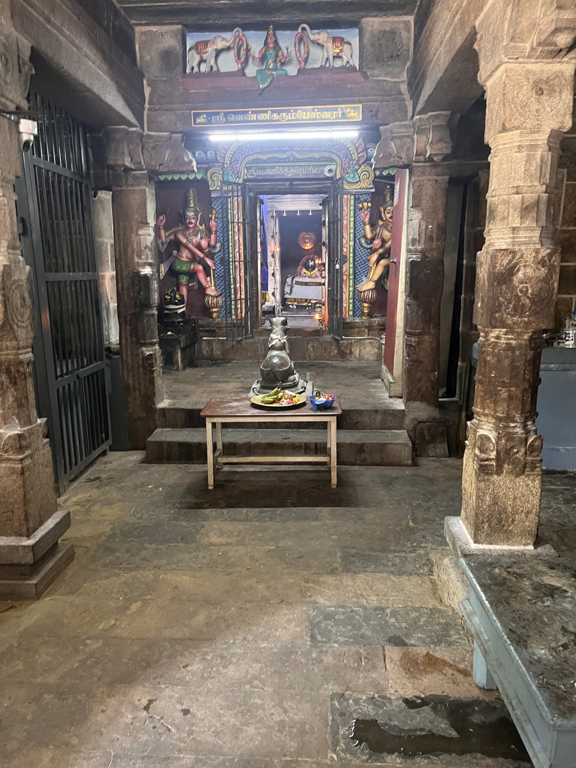 A small courtyard and a compact sanctorum, is what we saw. Prayed to Lord Shiva called Karumbeswarar with the priest performing the aarti. Karumbeswarar means ‘Lord of the sugarcane’. The priest explained that this place once abounded in sugar fields, over 200 years ago. King Kochengan Chola of the Early Chola dynasty was out hunting in this area when he noticed a strange phenomenon. A cow would come every day and spill all its milk over an anthill in the forest. Curious, the king dug up the anthill and found a Swayambhu Shiva lingam. While digging up the anthill, a shovel had hit the Shiva lingam and it appeared as if it was bleeding. Kochengan was alarmed but not for long, as a sweet juice similar to sugarcane oozed out of the lingam and the bleeding stopped. Kochengan Chola is said to have built this temple, one among the 70 odd Shiva temples he built, before being celebrated as one of the 63 Nayanars or saints. Is this temple that old? Looks new, was our refrain. The priest patiently explained that the kumbabhishekam or renovation had taken place in recent years and hence the bright, new look. The Venni Karumbeswarar temple finds a place in ancient Sangam literature and is one of the 275 Paadal Petra Sthalam with, Thirugnanasambandar singing about the Lord here.