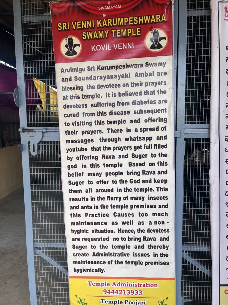 Now with gradually rising popularity, worshippers believed that offering sugar and sooji (rava) to the Lord here would relieve them of diabetes. A board has been put up by the temple authorities to offer prayers only and refrain from offering sugar and other sweet items as it leads to ants and other insects infestation affecting the hygiene of the temple. Good decision, never mind the grammar and misspellings.