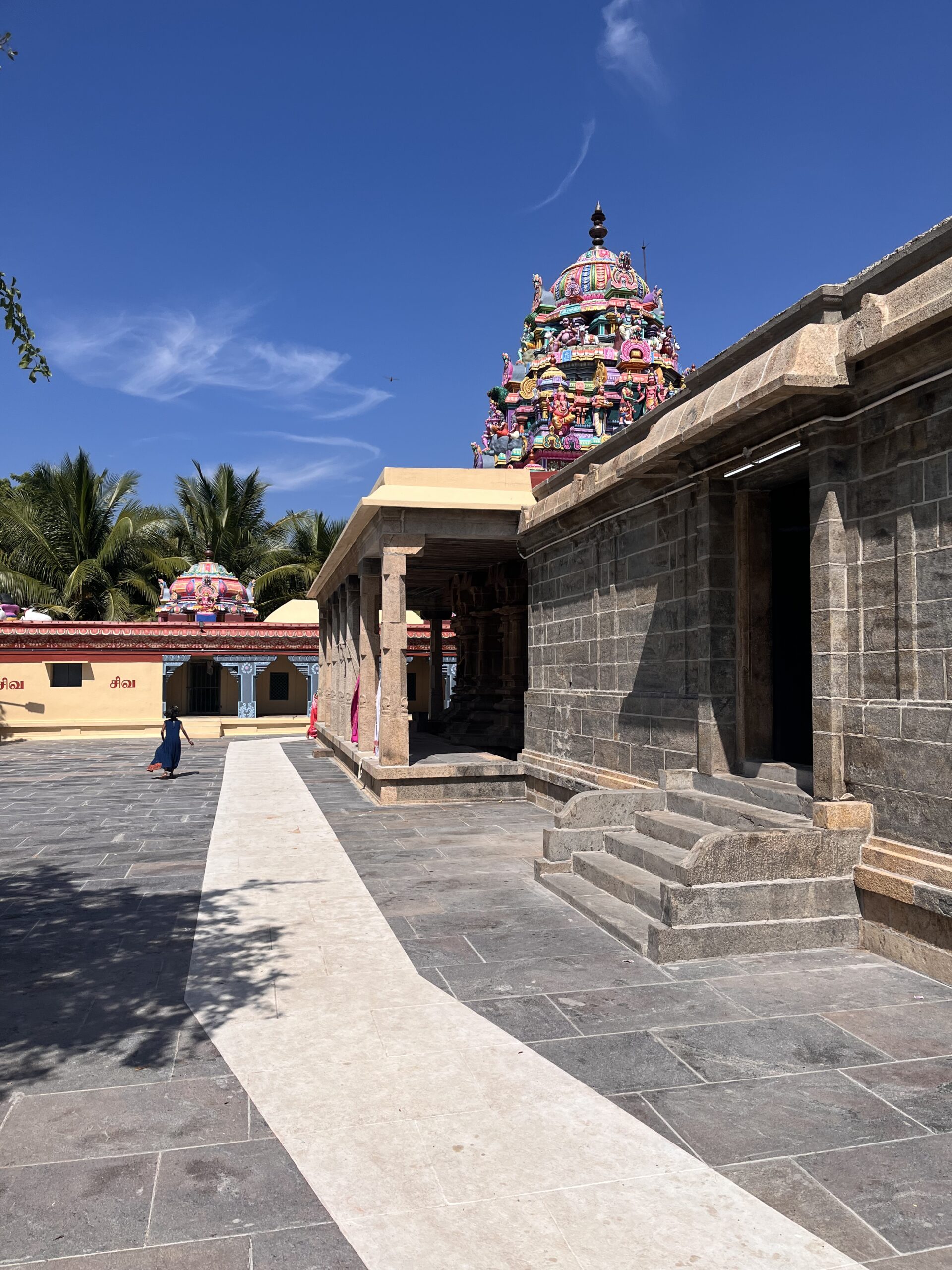 The temple stands on the banks of a channel of the Kaveri river and has just one shop selling pooja items.